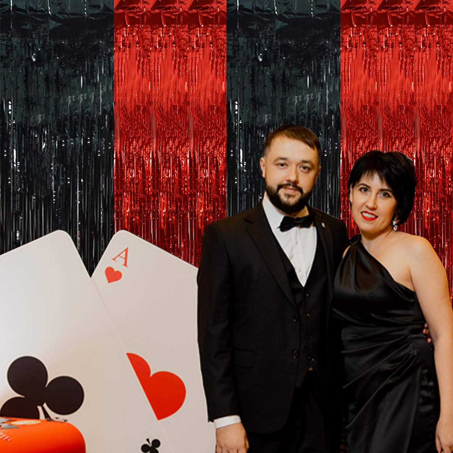 BEISHIDA 2Pcs Red Black Door Streamer Casino Backdrop Foil Fringe Tinsel Casino Horry Party Curtains Backdrops for Casino Party Horry Party Hallowen Decoration (3.28 ft x 6.56 ft)