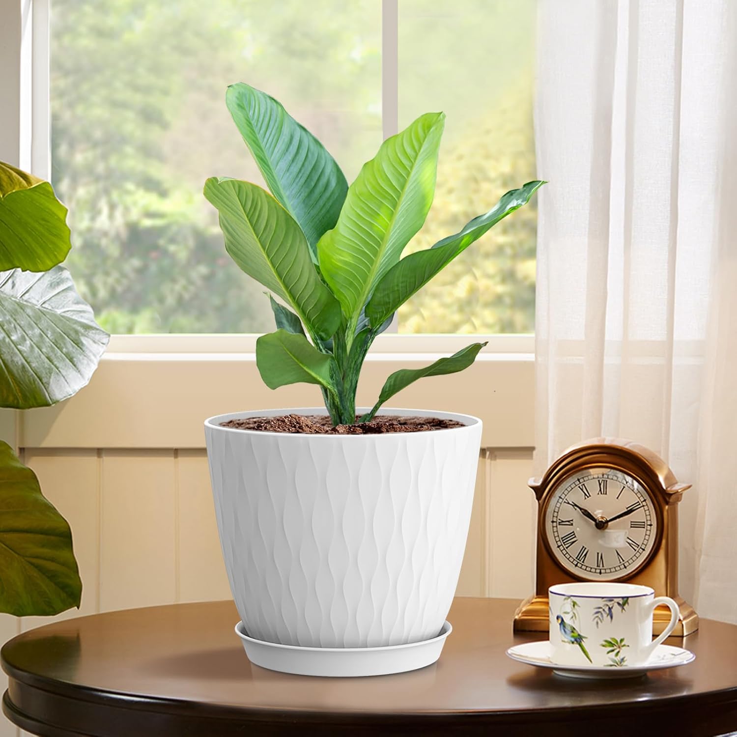 6 inch Flower Pots, 5 Pack Plant Pots with Drainage Holes and Saucers for Indoor Plants, Plastic Planters with Water Ripple for Small Garden House Plants, Nursery Pots for Succulent, White