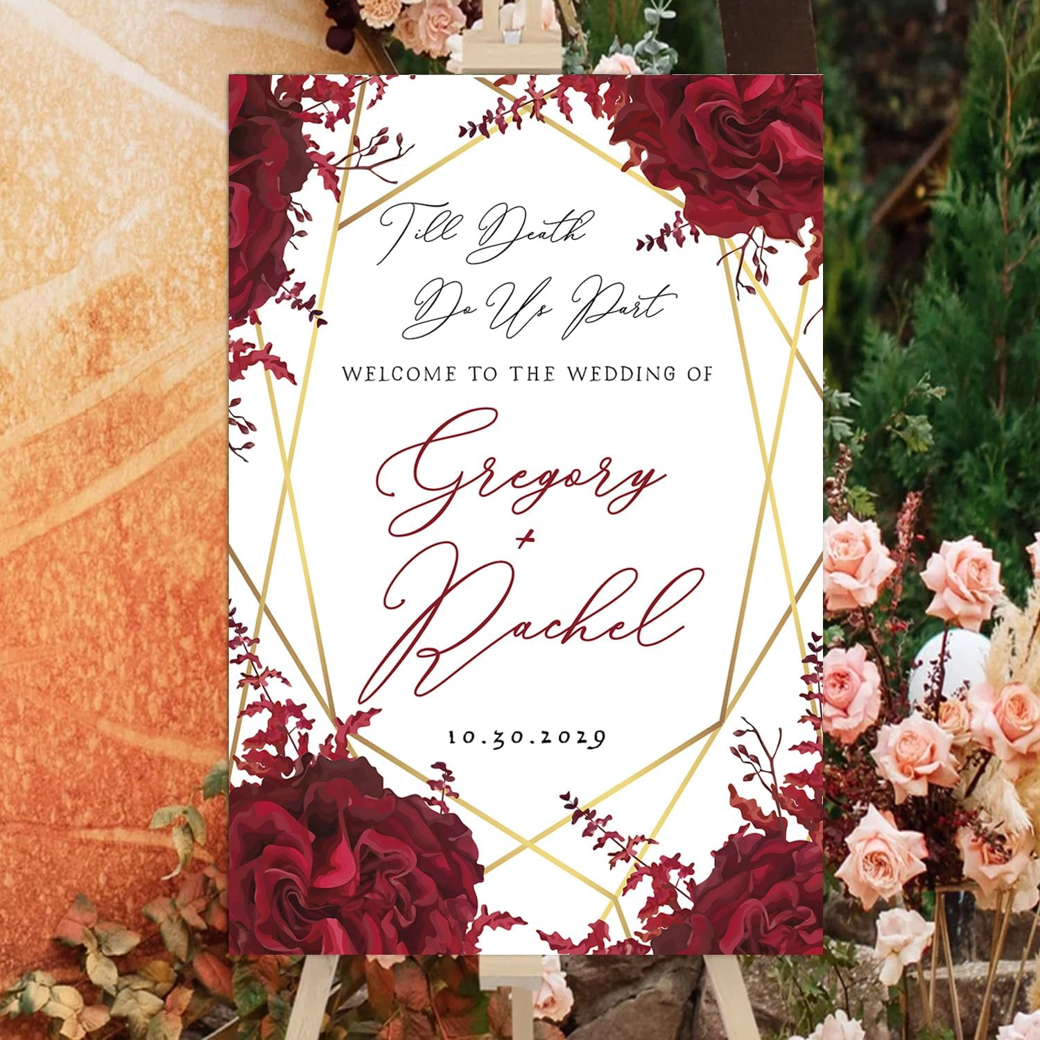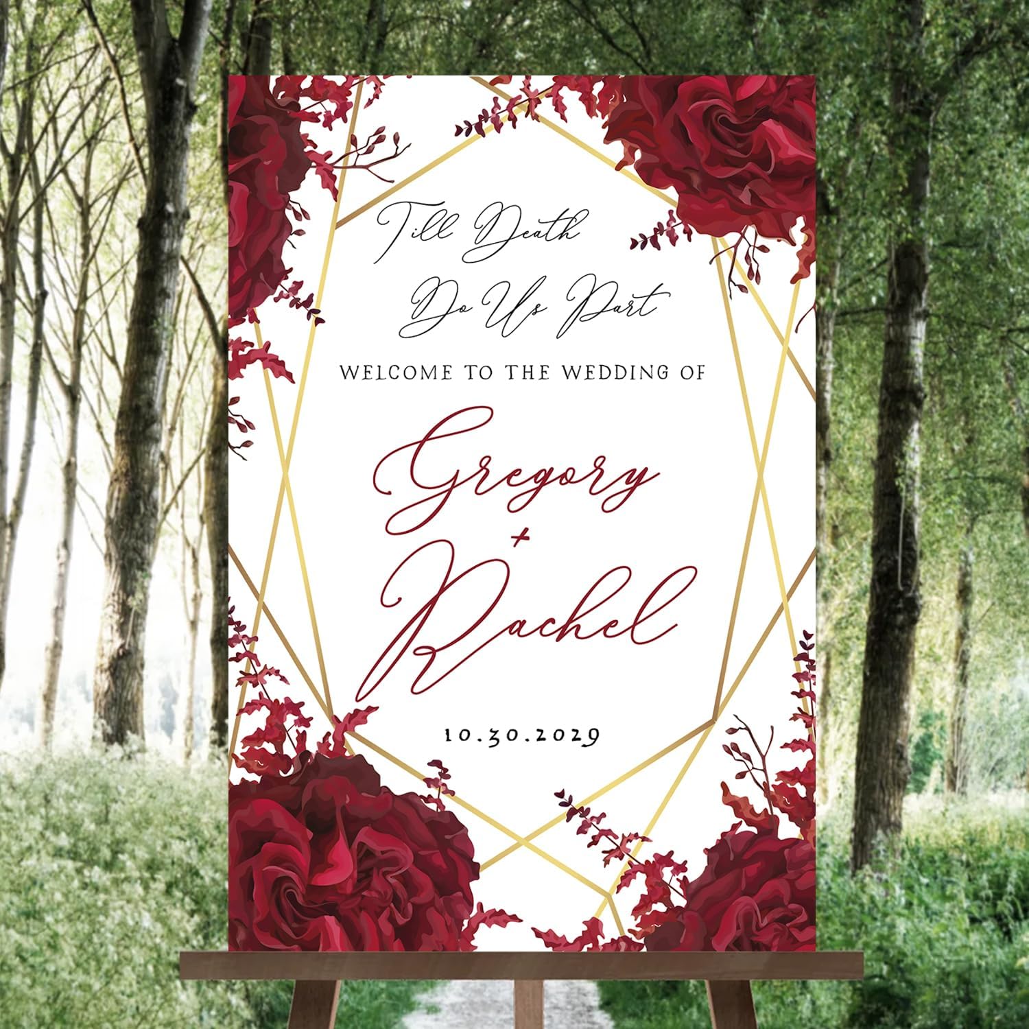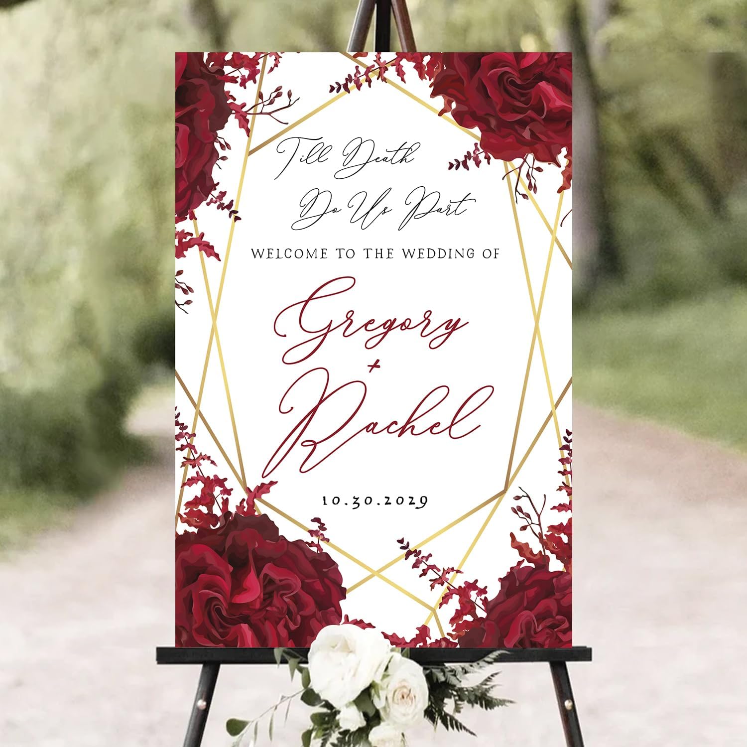 - A stunning choice for those planning a Gothic-inspired wedding or a Halloween-themed celebration. Whether you're exchanging vows on All Hallows' Eve or simply love the allure of Gothic aesthetics, this welcome sign will captivate your guests and make a bold statement.