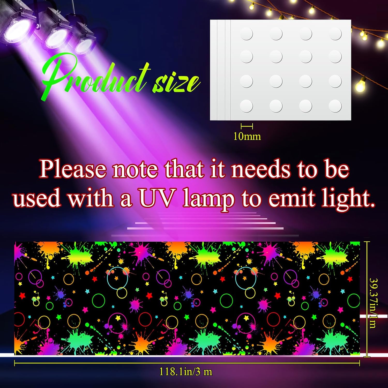 - Quality Material: this UV blacklight rug is mainly made of 95g quality fabric material with clear printing, soft and elegant, not easy to break or fade, and can serve you for a long time; Note: our rugs are primarily designed for party decoration, suitable for turning a neon tablecloth into the centerpiece of a party, or as an eye catching tapestry to decorate the wall, rather than traditional dance floor carpet