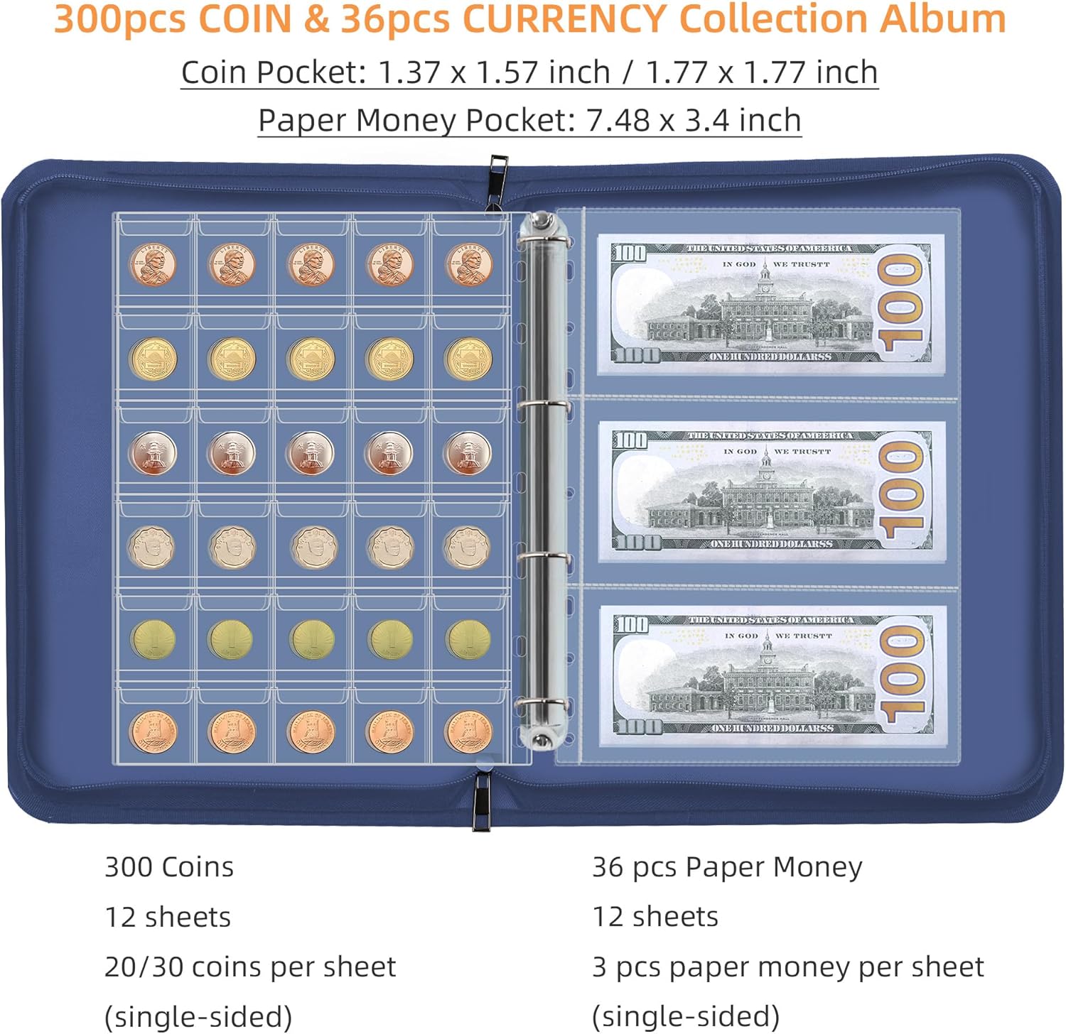 - Large Capacity for less than 45mm Coin and Currency:currency collection book has 12 pages plastic sheets for pennies, quarters, Silver Eagle, silver gold dollars, half dollars, silver bullion, challenge coins, and more coins(not exceed 45mm), 20 pockets per page total for over 120 coins and 30 pockets per page total for 180 coins , currency album comes with 12 page bill currency sleeves total 36 pockets for paper, money, stamp collecting supplies