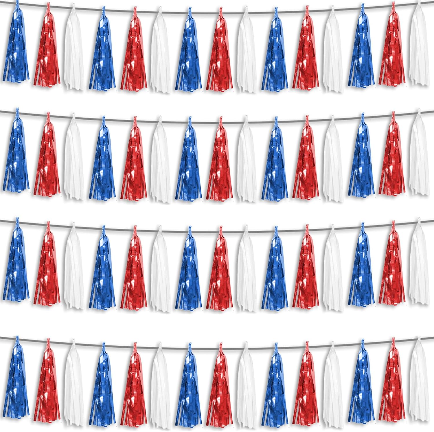 4P Red Blue White Foil Fringe Metallic Tassel Streamers Banner Tassel Garland for Parade Floats, Graduation, Wedding, Birthday, Halloween, Christmas, Independence Day, 4th of July, Party Decorations