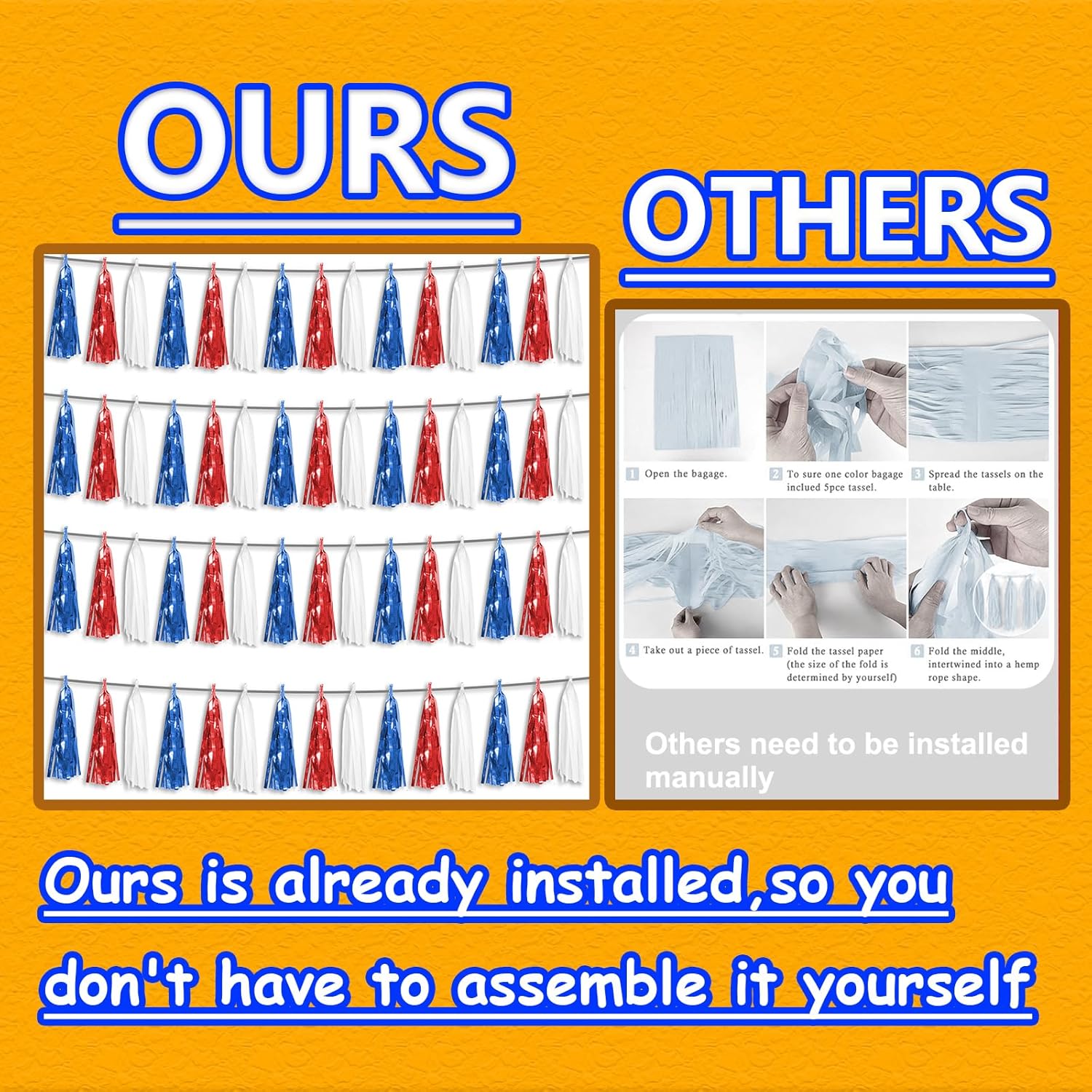 - Red Blue White Party Supplies Set】: The total length of the Red Bule White birthday tassels banner is 39.2 feet 60tassels, divided into 4 strips, each 9.8 feet long. Each banner contains 15 tassels, and each tassel measures 14 inches, for birthday decorations many occasions, and so on