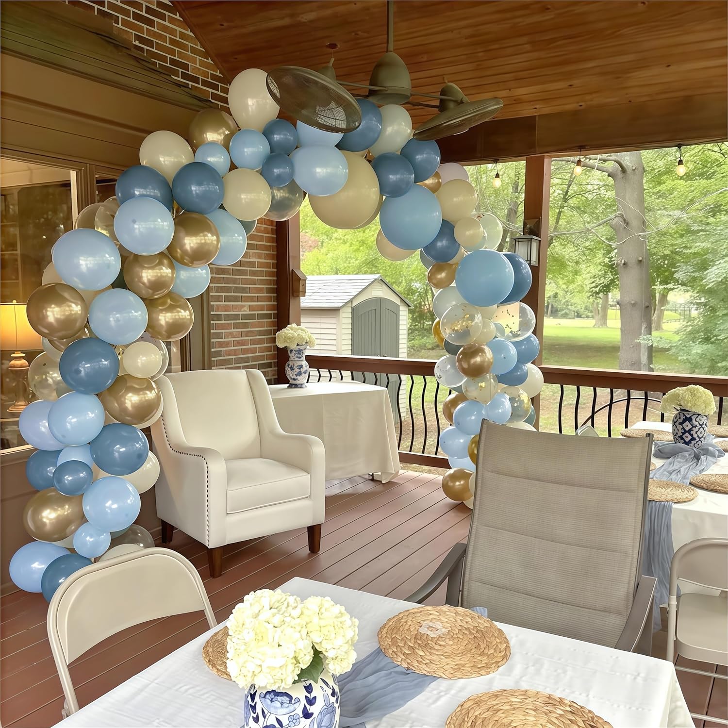 - š Dusty Blue Balloons Set: This is a beautiful bright balloon, which contains balloons of different colors. Include 12 inch white sand balloon(15pcs), dusty blue balloon(15pcs), Slate Baby Blue balloon(15pcs), metallic champagne gold balloon(10pcs), gold confetti balloon(5pcs), 2 rolls of ribbons. You can use these different shades of blue balloon kits, DIY balloon combinations to create your birthday party.