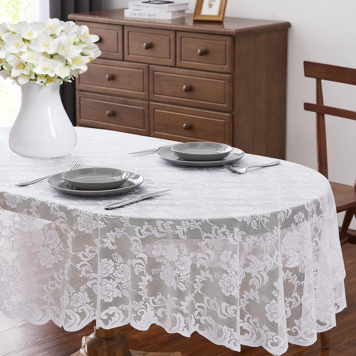 LinenZone White Oval Tablecloth for Rustic Vintage Decor. Sheer Lace Tablecloth Works Great As Wedding Tablecloth, Thanksgiving Tablecloth or Christmas Tablecloth (Mia Oval 104, White)