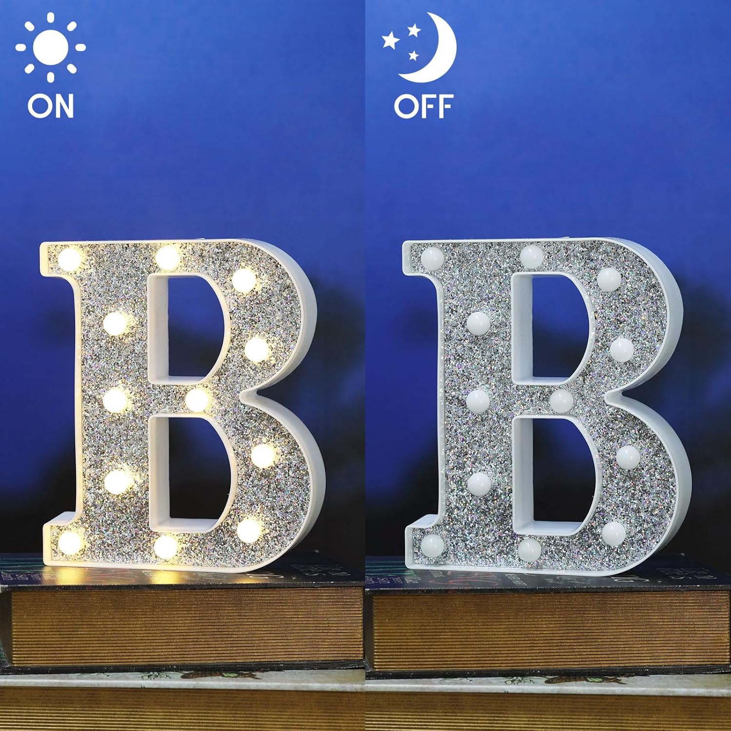 - π‘ Elegant Glitter Light-Up Letters with Silver Diamond Finish: These LED marquee light up letters feature a stunning glitter effect combined with a sophisticated silver diamond surface. Including all 26 alphabet letters and 10 numbers, these light up letters bring sparkle and elegance to any space, making them the perfect light letters for party decor, especially as light up letters for table settings or wall accents.