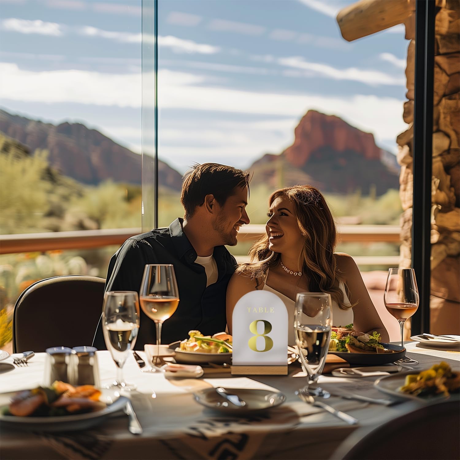 Wedding Table Numbers 1-25, Acrylic Arch Signs with Natural Wood Stands Holders, Rustic Table Decor for Reception & Parties (Frosted Gold)
