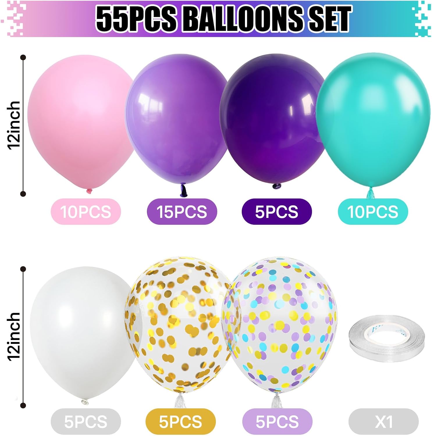 - 🎈12INCH BLUE PINK PURPLE BALLOONS: The package includes 55 pcs 12 inch balloons: 5 pcs gold confetti balloons, 5 pcs teal purple gold confetti balloons, 5 pcs dark purple balloons, 15 pcs purple balloons, 10pcs pink balloons, 5 pcs white balloons, 10pcs teal balloons and 1pc 10m ribbon. Enough quantity and different colors for satisfying your various decoration needs!