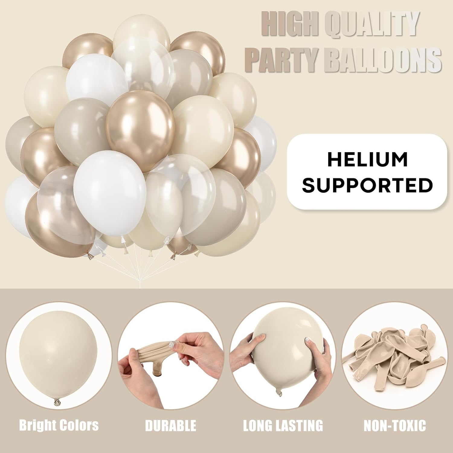 - 🎈12INCH BEIGE GOLD BALLOONS: The package includes 60 pcs 12 inch balloons: 15 pcs white sand balloons, 15 pcs white balloons, 15 pcs ivory white balloons, 9 pcs champagne gold balloons, 6pcs clear balloons and 1pc 10m ribbon. Enough quantity and different colors for satisfying your various decoration needs!
