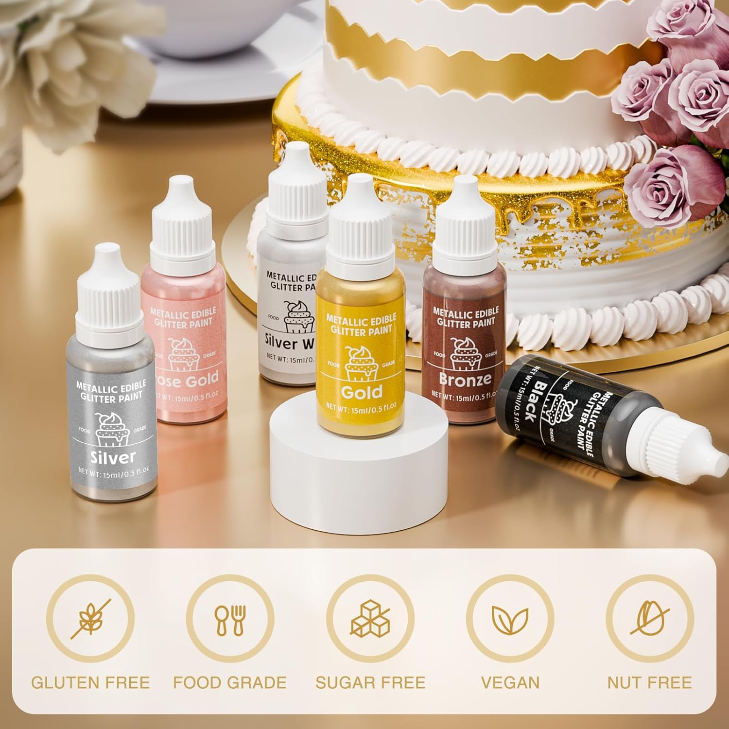 Edible Glitter Paint Set- 6 Color Food Coloring Metallic Glitter Paint for Baking, Cake Decorating - Food Grade Art Decorative Cake Paint for Cupcakes, Cookies, Fondant, Donuts, Macaron, Candy (metal, 6 color)