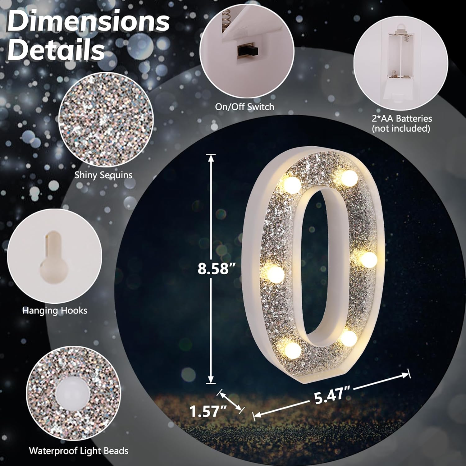 Marquee Light Up Letters, Glitter Silver LED Letter Lights Battery Powered Alphabet Letter Sign for Night Light Wedding Birthday Party Cafe Bar Decoration Girls Room Decor - Number 0