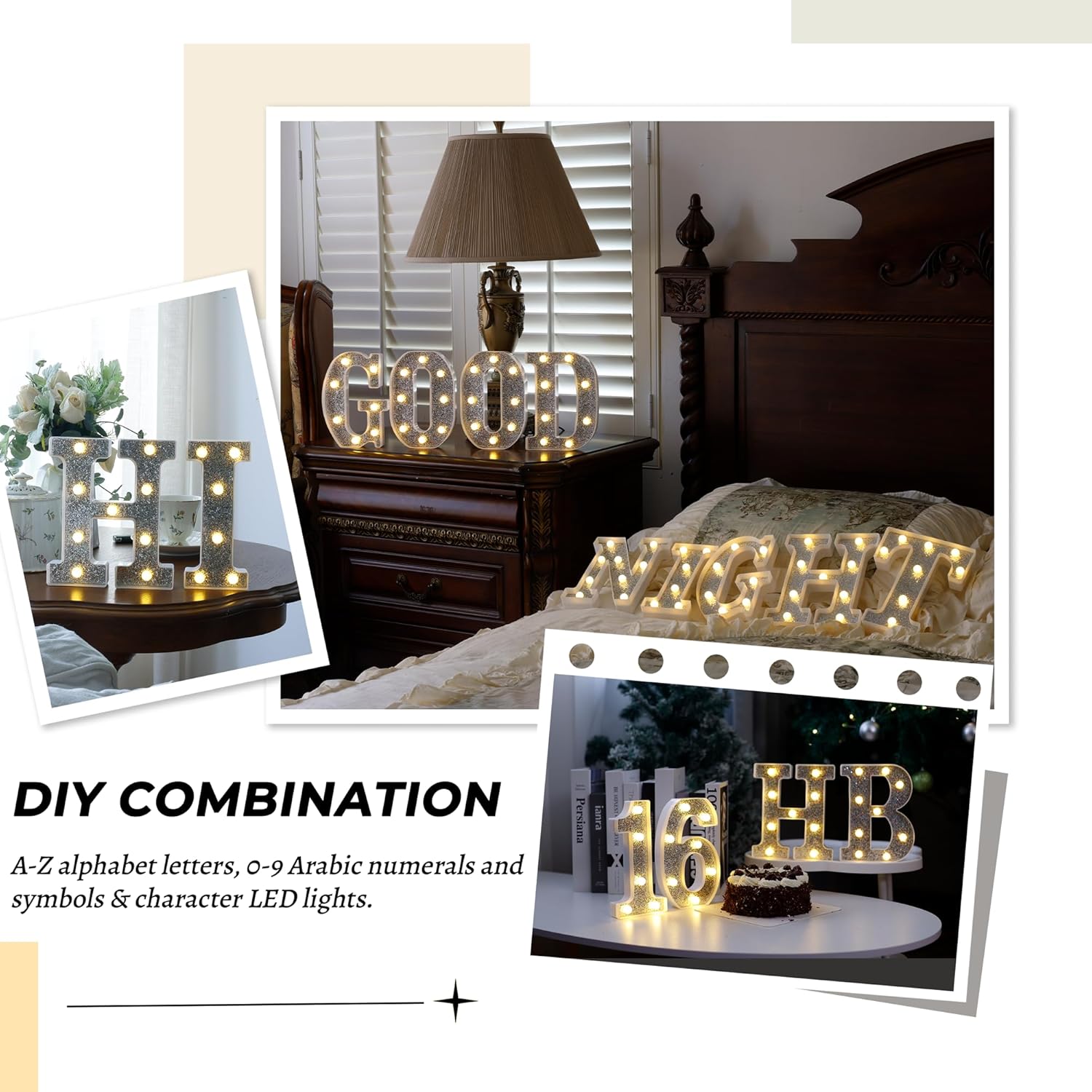 - 【Glitter Silver Marquee LED Letters】Unlike normal white lighted letters, these LED letter lights are covered with shiny silver glittering sequins. Whether it is turned on or off, these glitter marquee lights give a bright eye-catching glow. You can use it to beautify your dining table and light up your party. Create a dreamlike and romantic atmosphere.