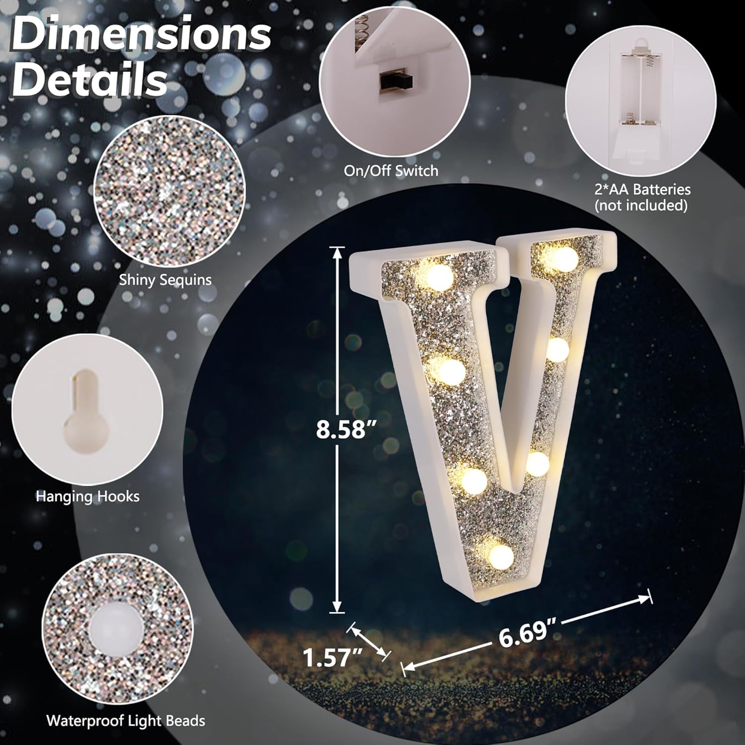 Marquee Light Up Letters, Glitter Silver LED Letter Lights Battery Powered Alphabet Letter Sign for Night Light Wedding Birthday Party Cafe Bar Decoration Girls Room Decor - V