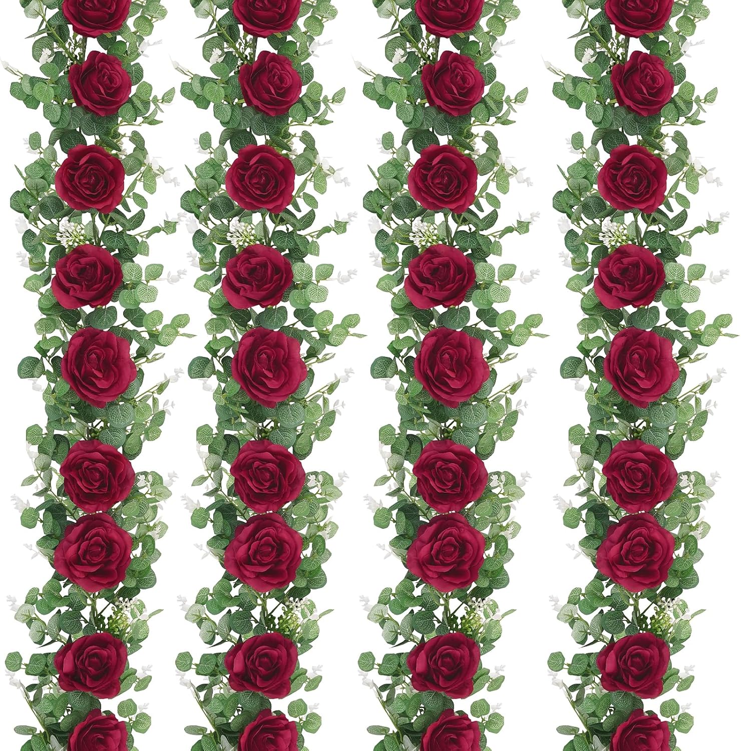 - 🌹PACKAGE INCLUDES: The package includes 4 Pcs artificial eucalyptus garland with flowers. Each piece of flower vine is 6.5Ft/2M long and decorated with 8 red roses, eucalyptus leaves and seeds. There are also many small plastic rings distributed on the vine for easy hanging. You can easily trim or bend the shape according to your own preferences and decorative needs.
