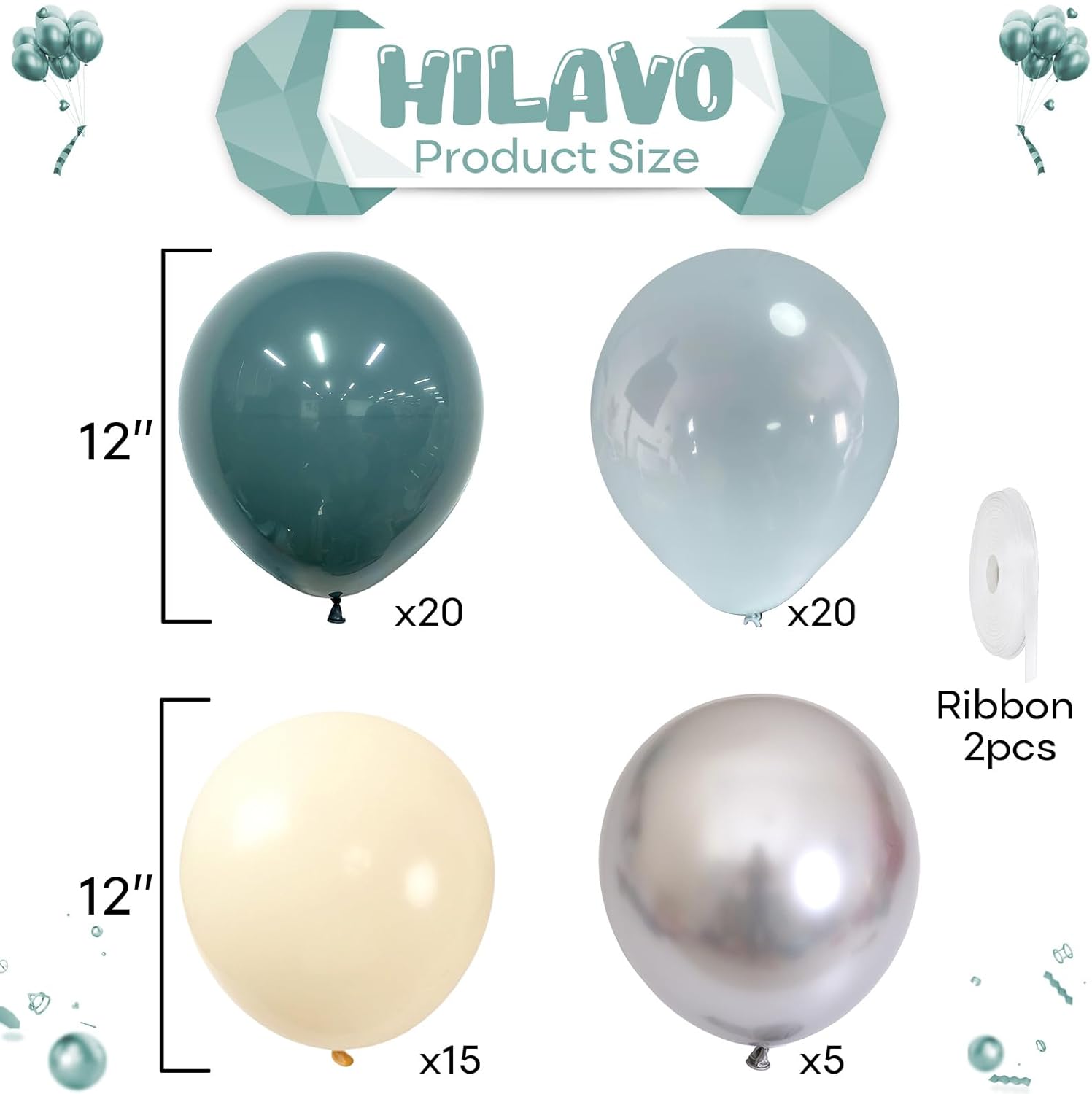 - š Dusty Blue and Ivory White Balloons Set: This is a beautiful bright balloon, which contains balloons of different colors. Include 12 inch dusty blue balloon(20pcs), retro fog blue balloon(20pcs), ivory white balloon(15pcs), metallic silver balloon(5pcs), 2 rolls of ribbons. You can use these different shades of blue balloon kits, DIY balloon combinations to create your birthday party.