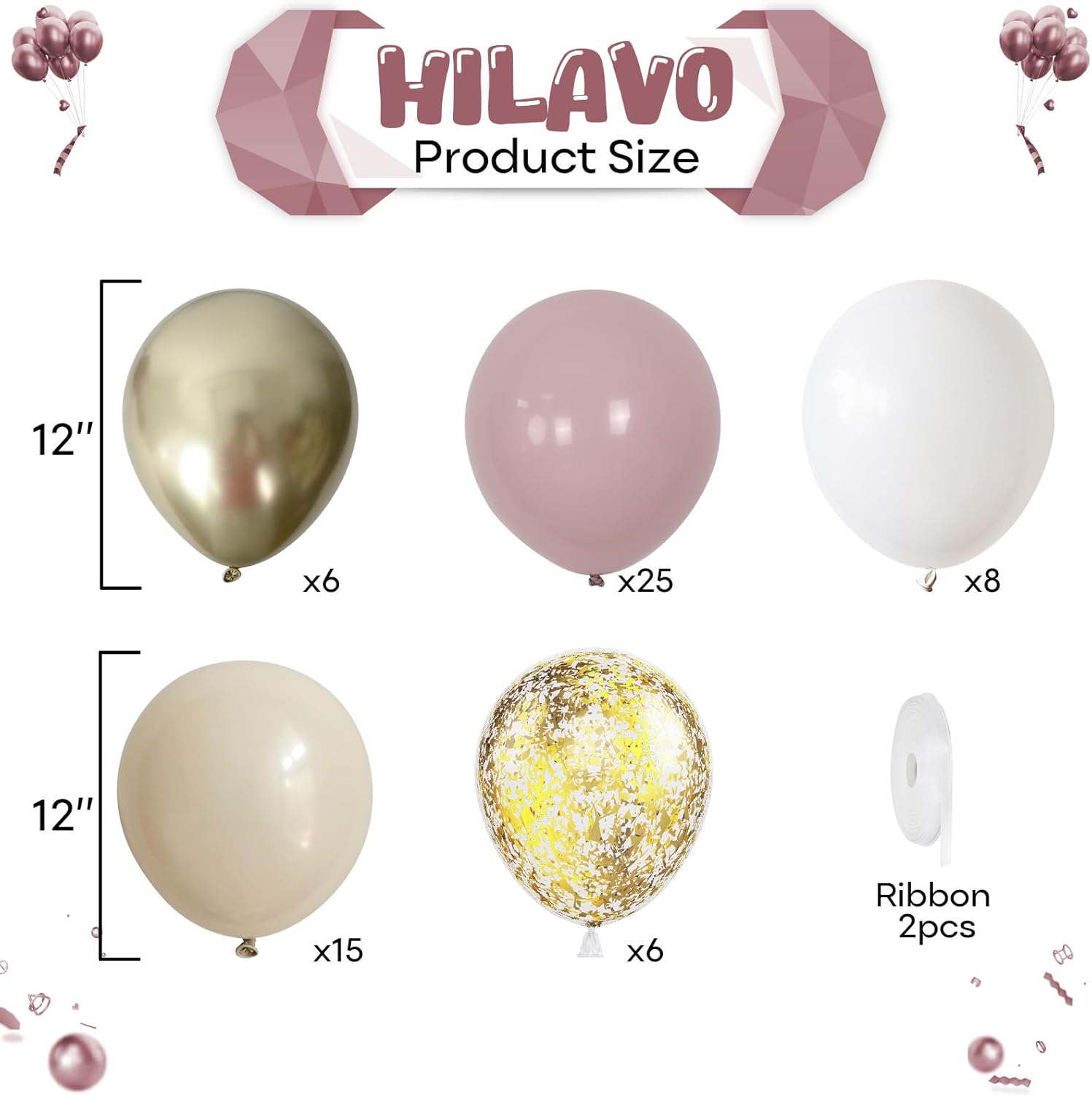 - šø Dusty Pink and Gold Balloons Set: This is a beautiful bright balloon, which contains balloons of different colors. Include 12 inch dusty pink balloon(25pcs), retro white sand balloon(15pcs), white balloon(8pcs), metallic gold balloon(6pcs), gold confetti balloon(6pcs), 2 rolls of ribbons. You can use these different shades of fog pink and gold balloon kits, DIY balloon combinations to create your birthday party.