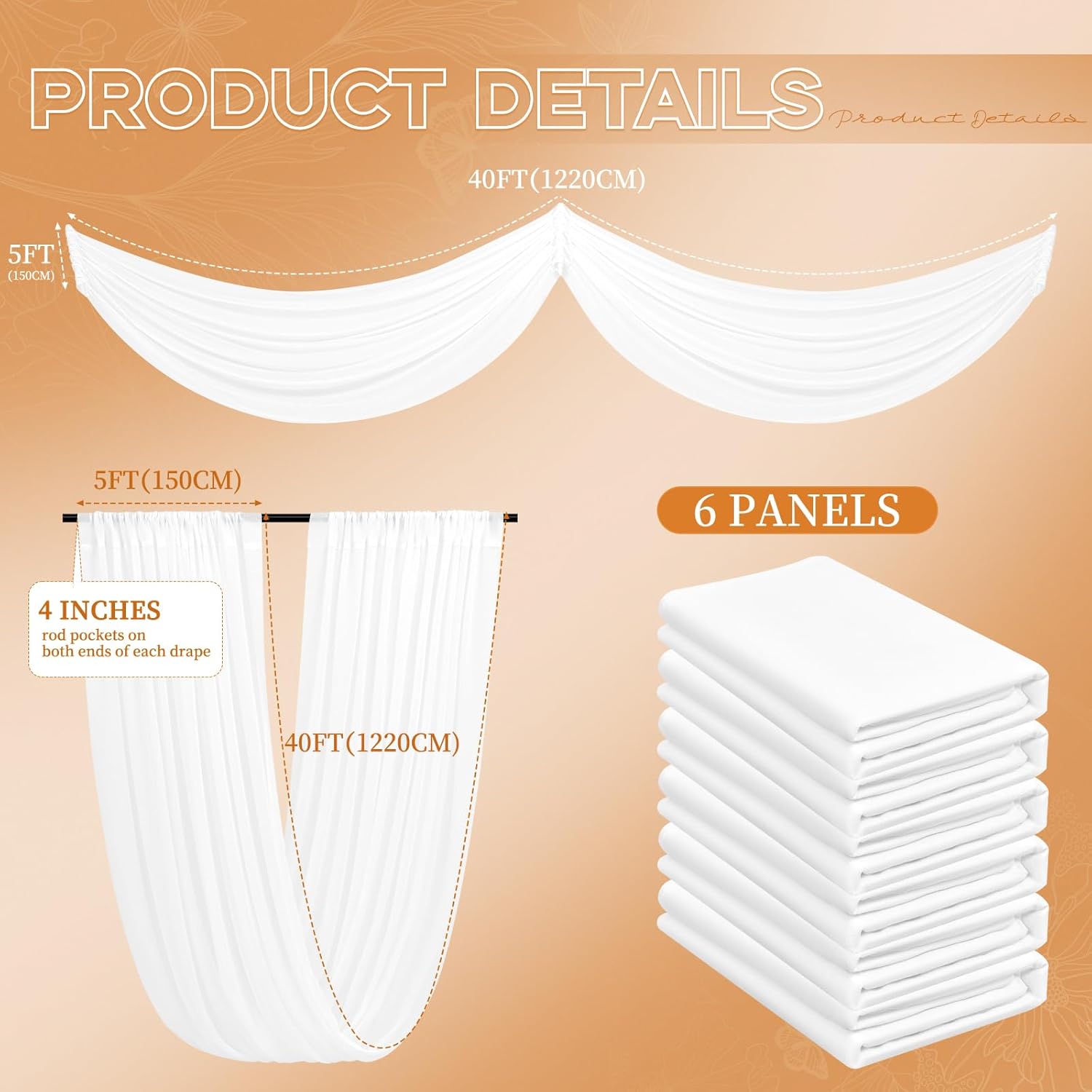 6-Panel White Ceiling Drapes - 5ftx40ft Sheer Curtains for Wedding Arch & Stage Decorations