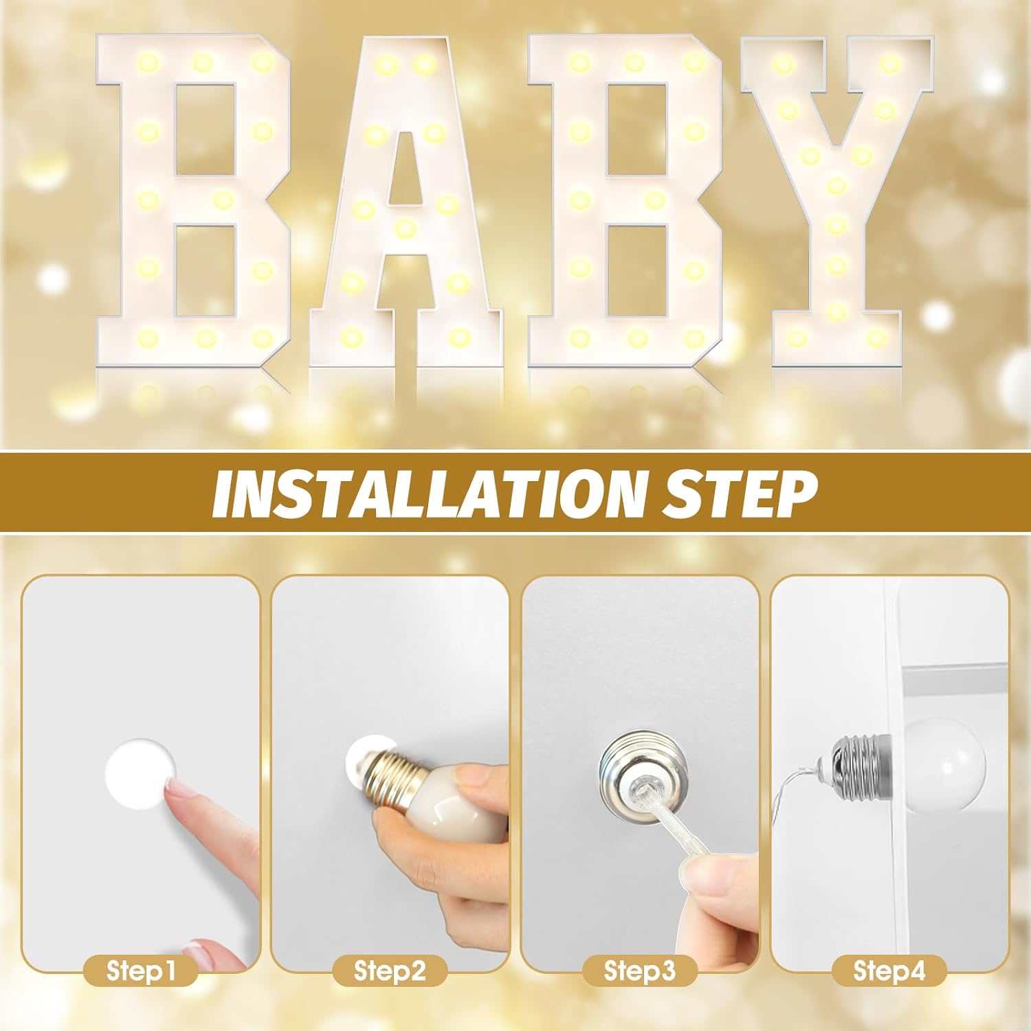 - 【Assembly Required】Each marquee light up letters is made of precisely pre-cut foam board, comes with the same model of light string and LED bulb, and a user-friendly instruction manual. According to our installation manual, ① Fold the side panels along the cutting line and stick them to the bottom panel with hot melt glue according to the corresponding number. ② Screw the bulb onto the single board, and then install the LED light string into the bulb. (Note: Glue gun and battery not included)