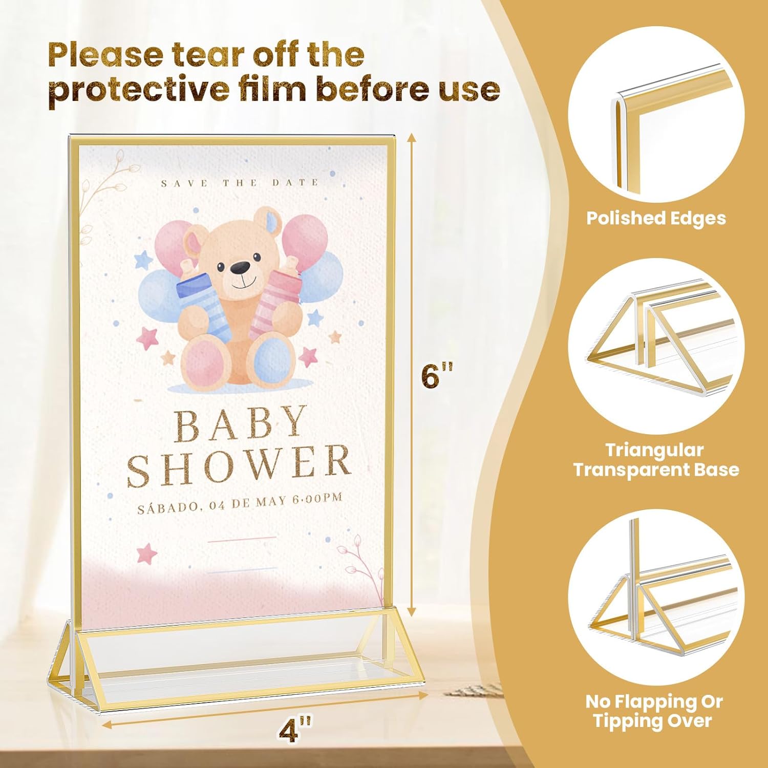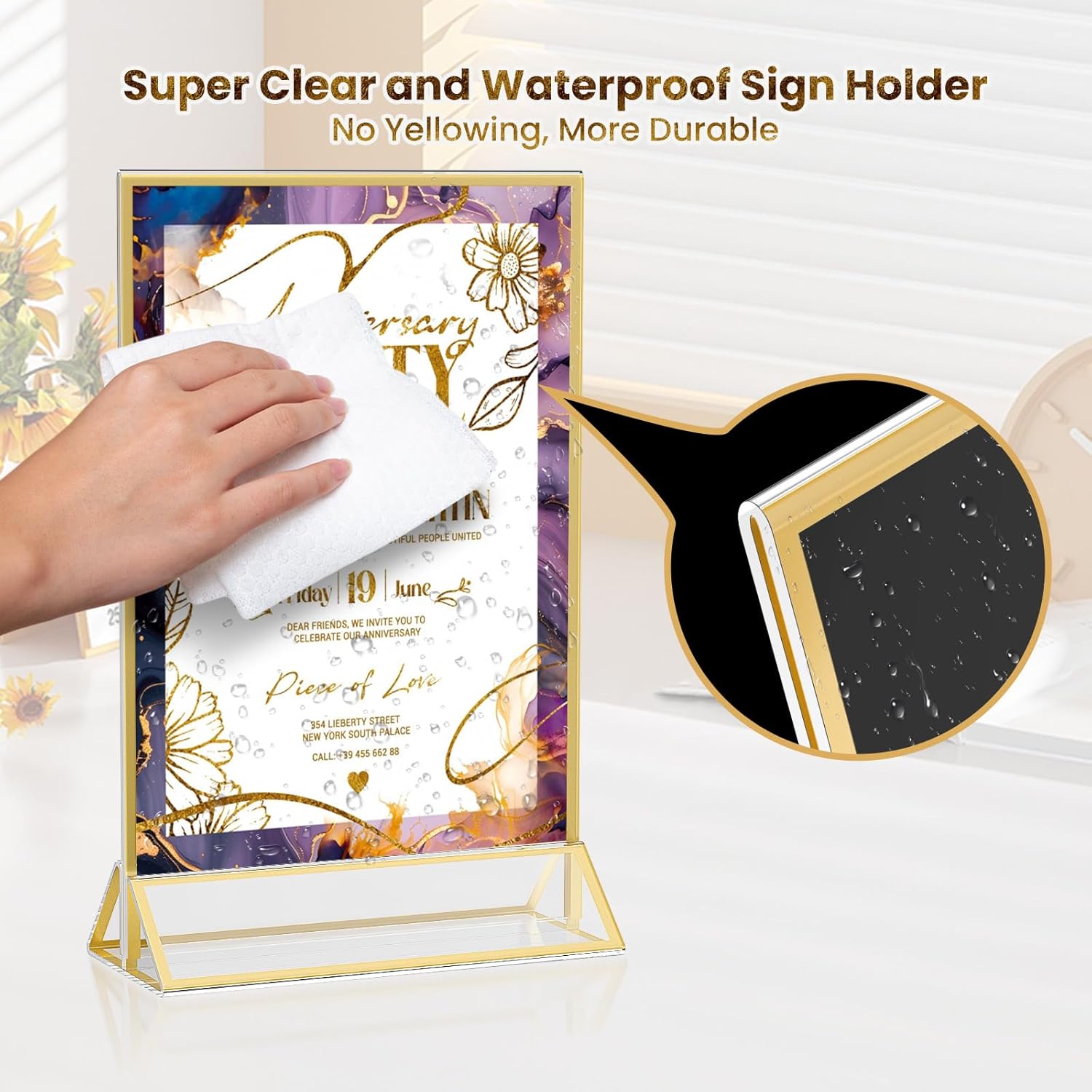 - 【Premium Acrylic Material】Our acrylic 4 x 6 gold sign holders are made of high-quality acrylic plastic glass, which can effectively resist falling. The clear acrylic sign holder will not dim or turn yellow under continuous exposure to the sunlight which offers a superb display effect.