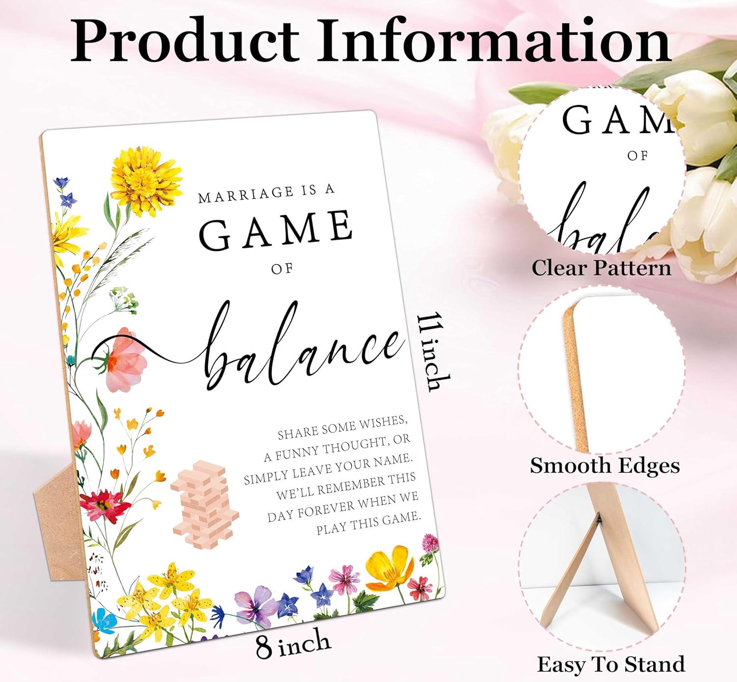 Marriage Is A Game Of Balance Sign, Floral Wedding Ceremony Sign, Pack of 1 Wooden Tabletop Sign with Stand, Wedding Supplies, Engagement and Reception Wedding Decorations - LD17