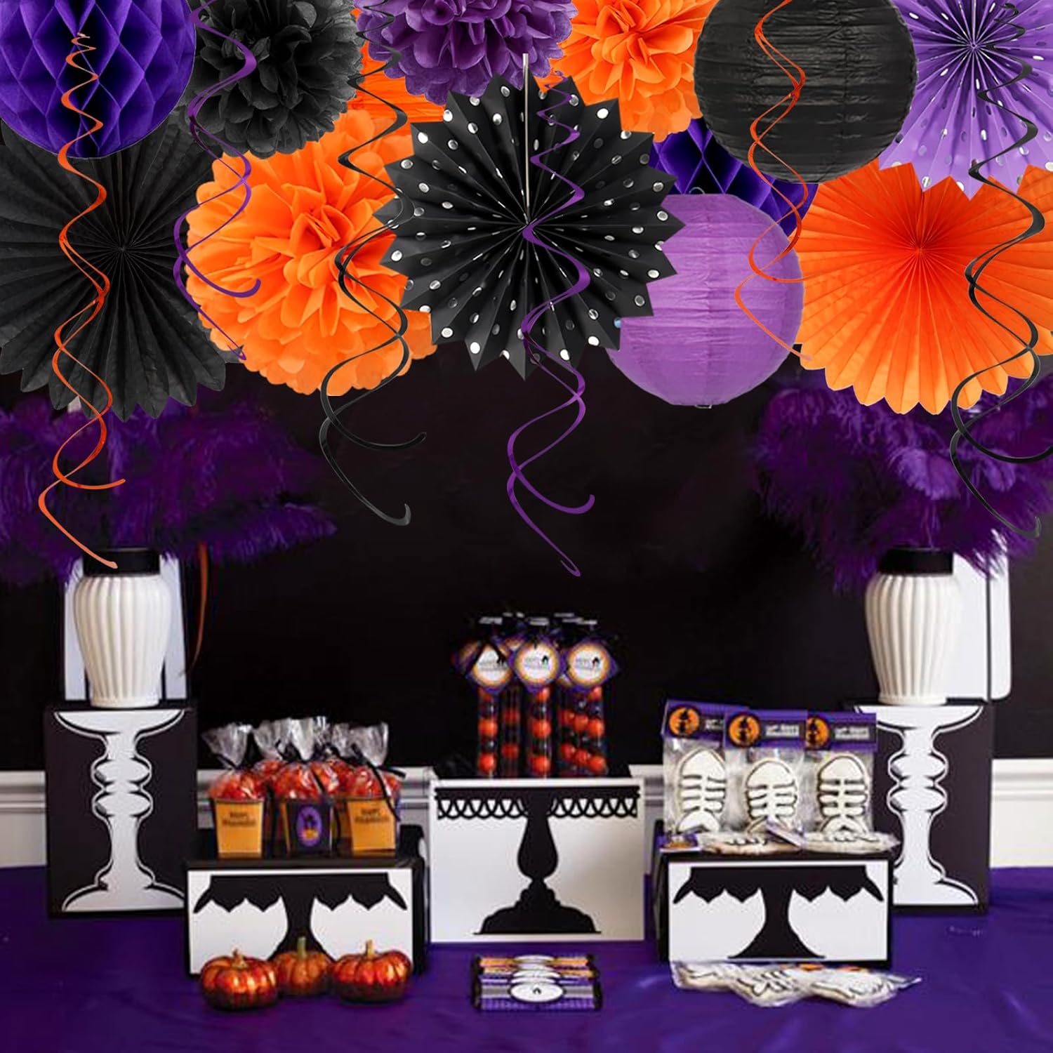 - ăBlack Purple Orange Party KitsăThis kits include 1pcs happy halloween banner, 1pcs circle dots paper banner, 4pcs tissue pom poms: 3pcs 10" and 1pcs 12" , 3pcs 8inch paper honeycom ball, 2pcs 8inch paper lantern, 4pcs 12inch paper flower fan, 6pcs Paper swirls hanging streamers.
