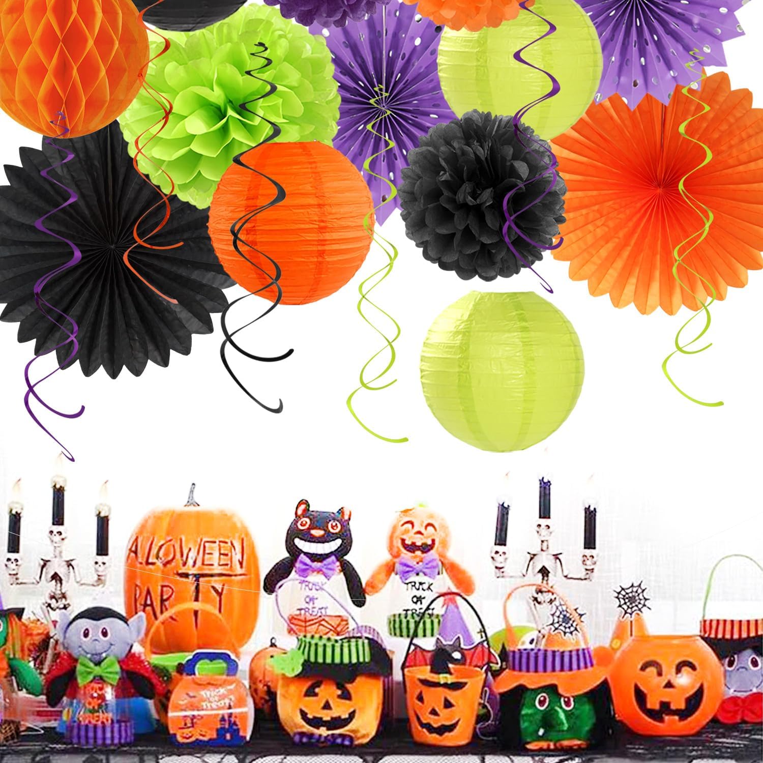 - 【Black Green Orange Purple Party Kits】This kits include 1pcs happy halloween banner, 1pcs circle dots paper banner, 4pcs tissue pom poms: 3pcs 10" and 1pcs 12" , 3pcs 8inch paper honeycom ball, 2pcs 8inch paper lantern, 4pcs 12inch paper flower fan, 6pcs Paper swirls hanging streamers.