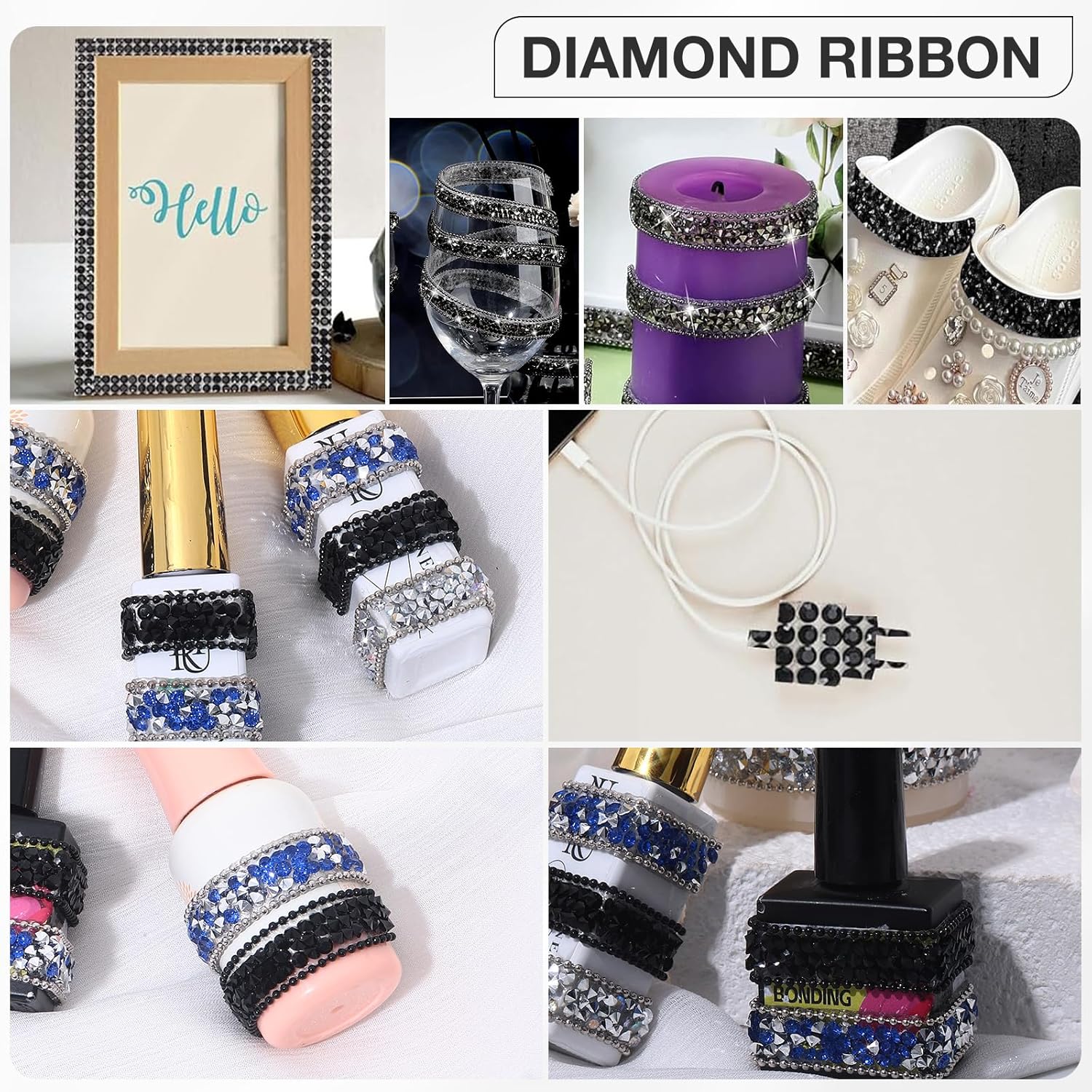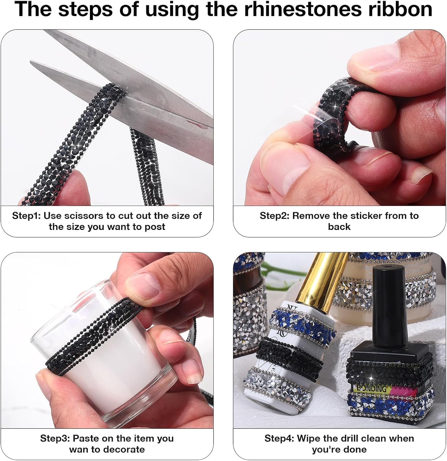 - Black Rhinestone Ribbon: 1 roll of self-adhesive rhinestone ribbon Sticker, approx 3 yards in length, 1cm/0.4inch in width. (PACKAGE CONTENT)