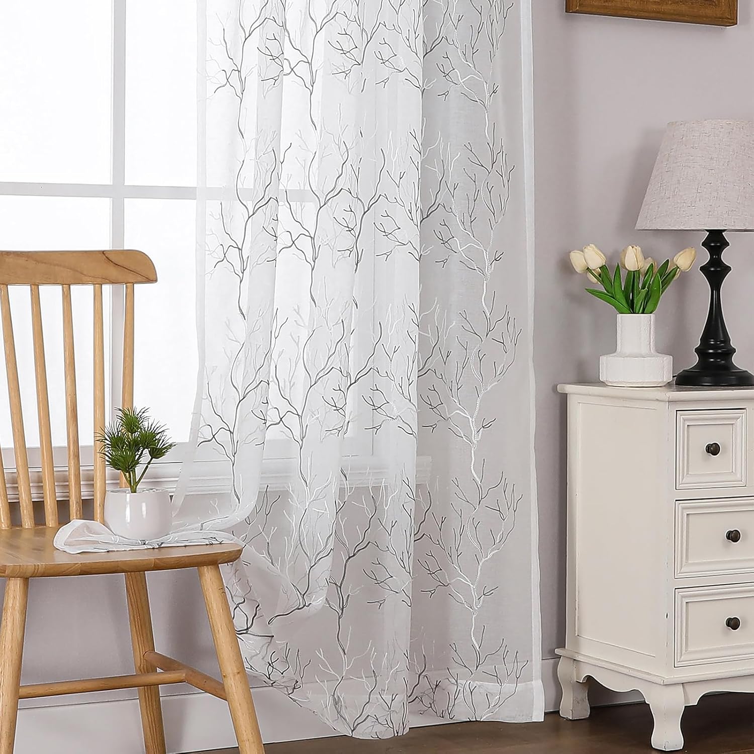 VISIONTEX Sheer Curtains 84 inch Length 2 Panels Set, Decorative Grey Coral Embroidery, Rod Pocket Embroidered Window Drapes for Living Room and Bedroom, 54" x 84"