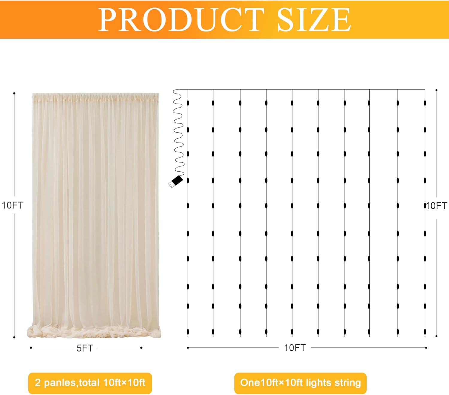 - Package Includes: The package includes 2 panels champagne sheer tulle backdrop curtains, each curtain backdrop is 5FT width and 10FT height. Also it includes a set of 10FT (10 strands) warm string light (USB Powered) and 12pcs transparent clips.