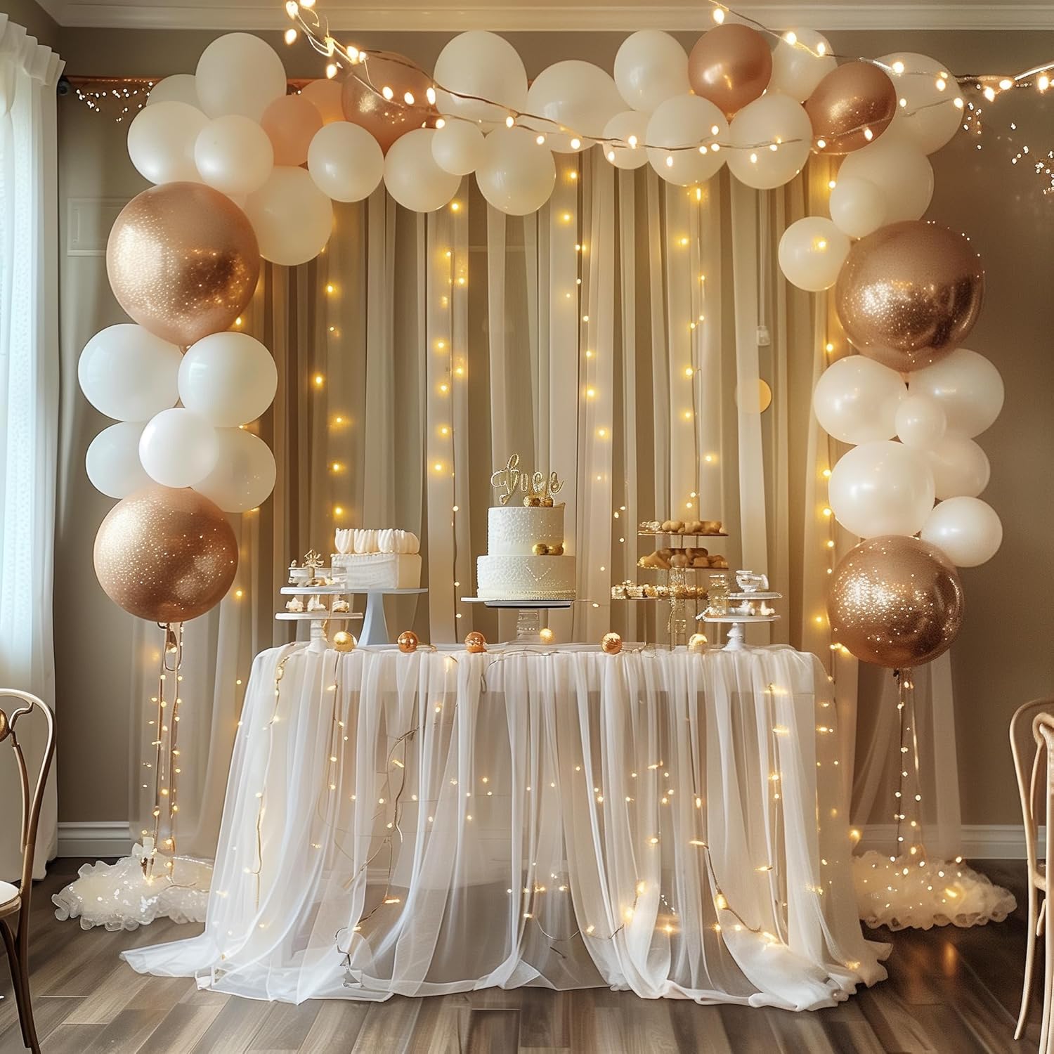 - Package Includes: 2 panels champagne tulle backdrop curtains, each sheer curtain backdrop is 5FT width and 8FT height. Also it includes a set of 10FT (10 strands) warm string light (USB powered,no remote control) and 12pcs transparent clips.