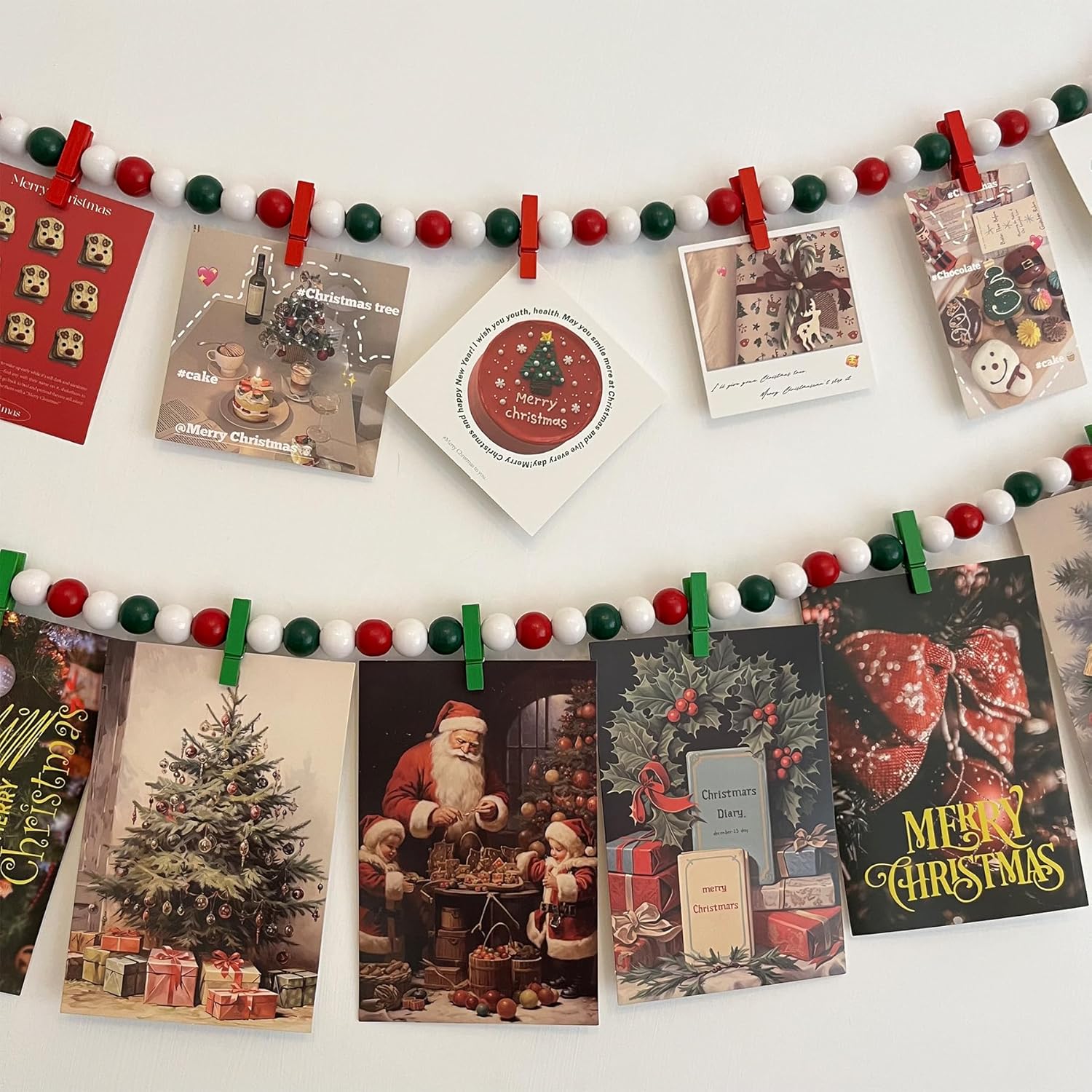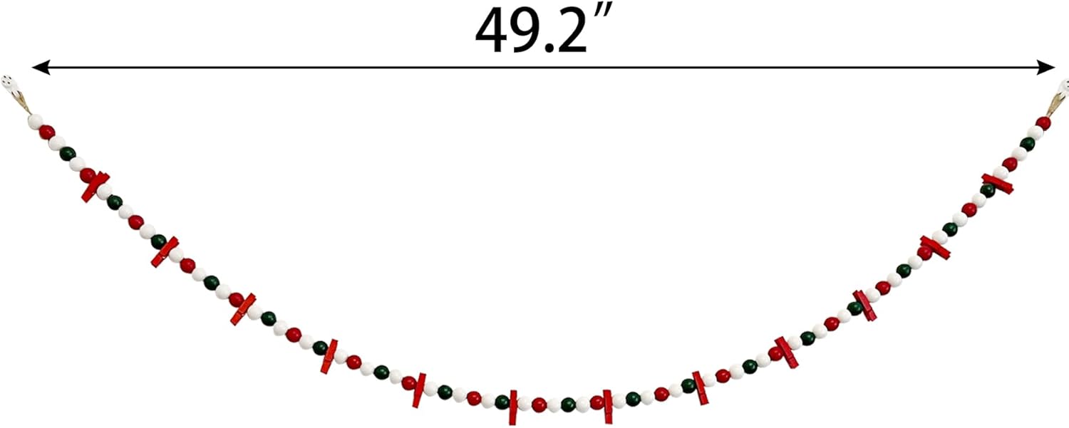 - Christmas Decorations: Christmas wooden beads garland wall mounted photo clip each with 12 clips, wooden beads are made of white green white red regular sorted combination, received 2pcs, respectively, is based on red clips, green clips. Clips are fixed in the middle of the beads, can not be removed