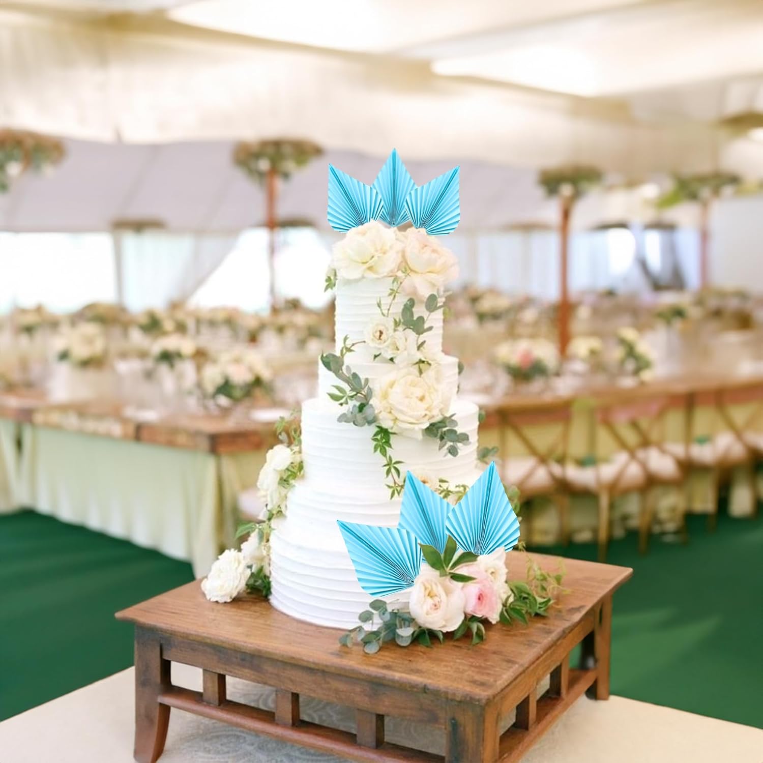 Ephlyn 6Pcs Paper Palm Fan Cake Topper Palm Leaf Fan Cake Pick Decoration for Insert DIY Craft Project Home Made Wedding Bridal Shower Birthday Anniversary Party Cake Decorations Blue