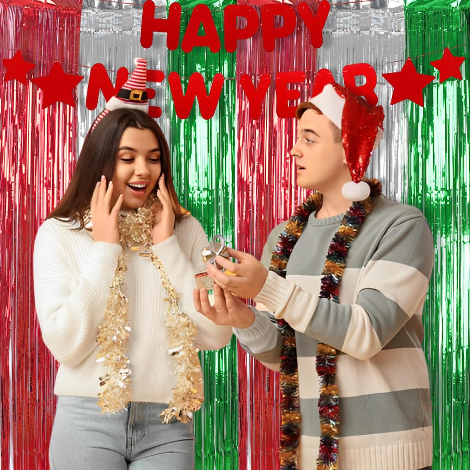 BRAVESHINE 2 Pack Fringe Backdrop Red Silver Green Christmas Party Decorations 3.2 x 6.6 ft Tinsel Foil Curtain Party Streamer Metallic Photo Backdrop for Christmas, New Year Decor