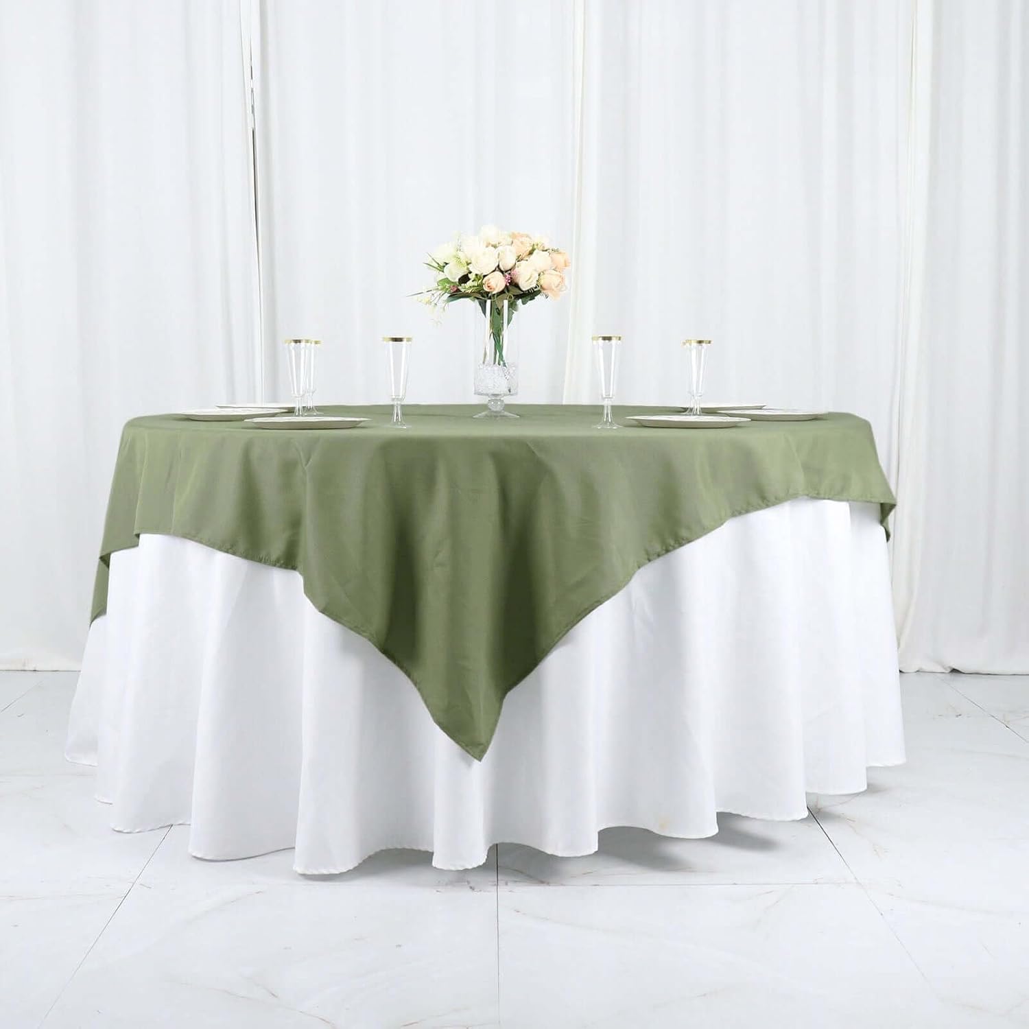 - Quantity: 1 Square Tablecloth Material: 100% Polyester Color: Eucalyptus Sage Green Size: 70" x 70" Thickness: 130 GSM Stain & wrinkle resistant, machine washable 1 piece, seamless design Hemmed edges for an exquisite look.
