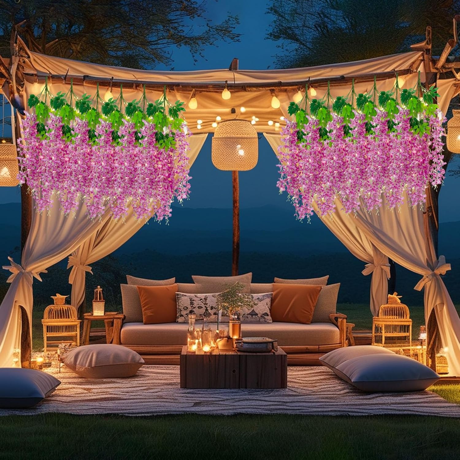 12 Pack Purple Red Wisteria Hanging Flowers Garland with Lights, 3.44 Feet Artificial Flower Vines, Fake Wisteria, Artificial Vines Hanging Garland for Backdrop Outdoor Patio Garden Decor