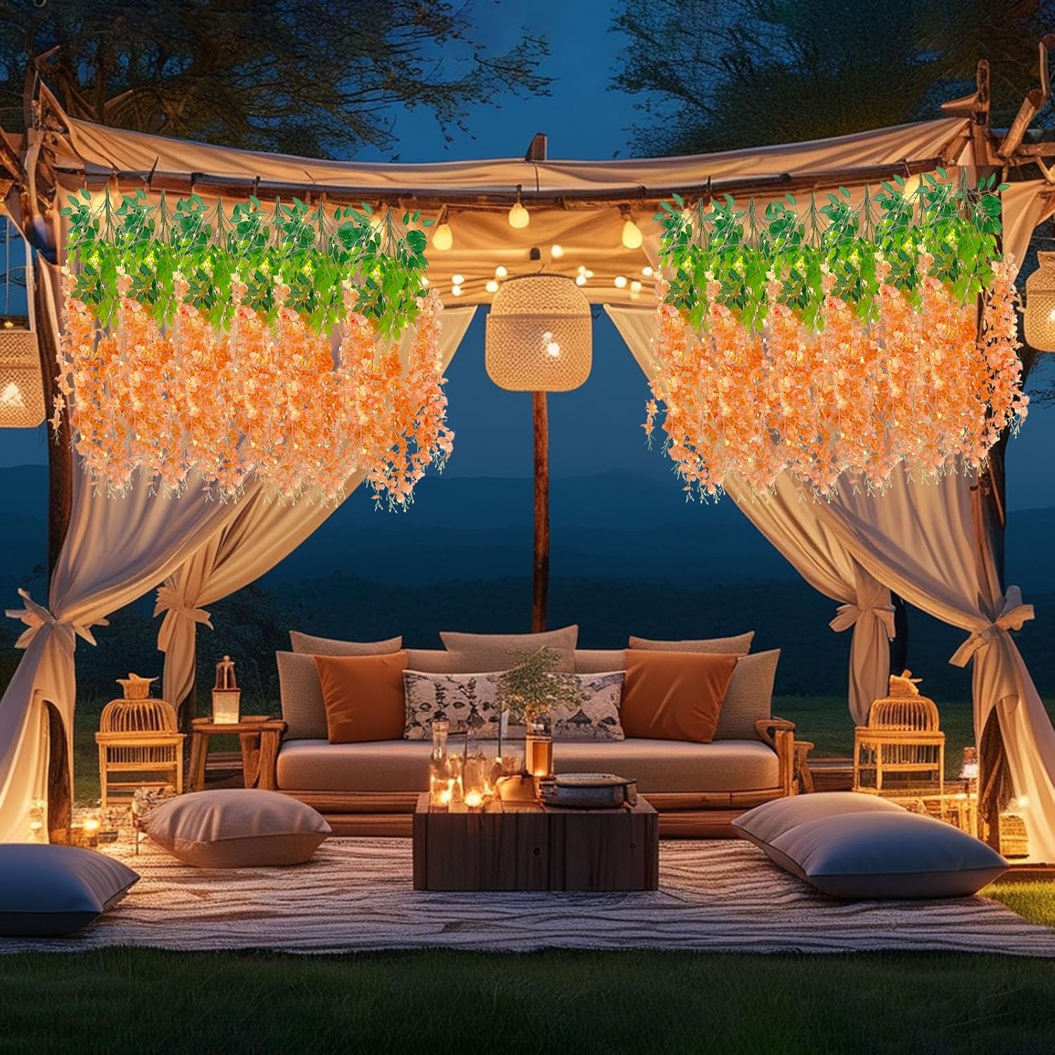 12 Pack Orange Wisteria Hanging Flowers Garland with Lights, 3.44 Feet Artificial Flower Vines, Fake Wisteria, Artificial Vines Hanging Garland for Backdrop Outdoor Patio Garden Decor