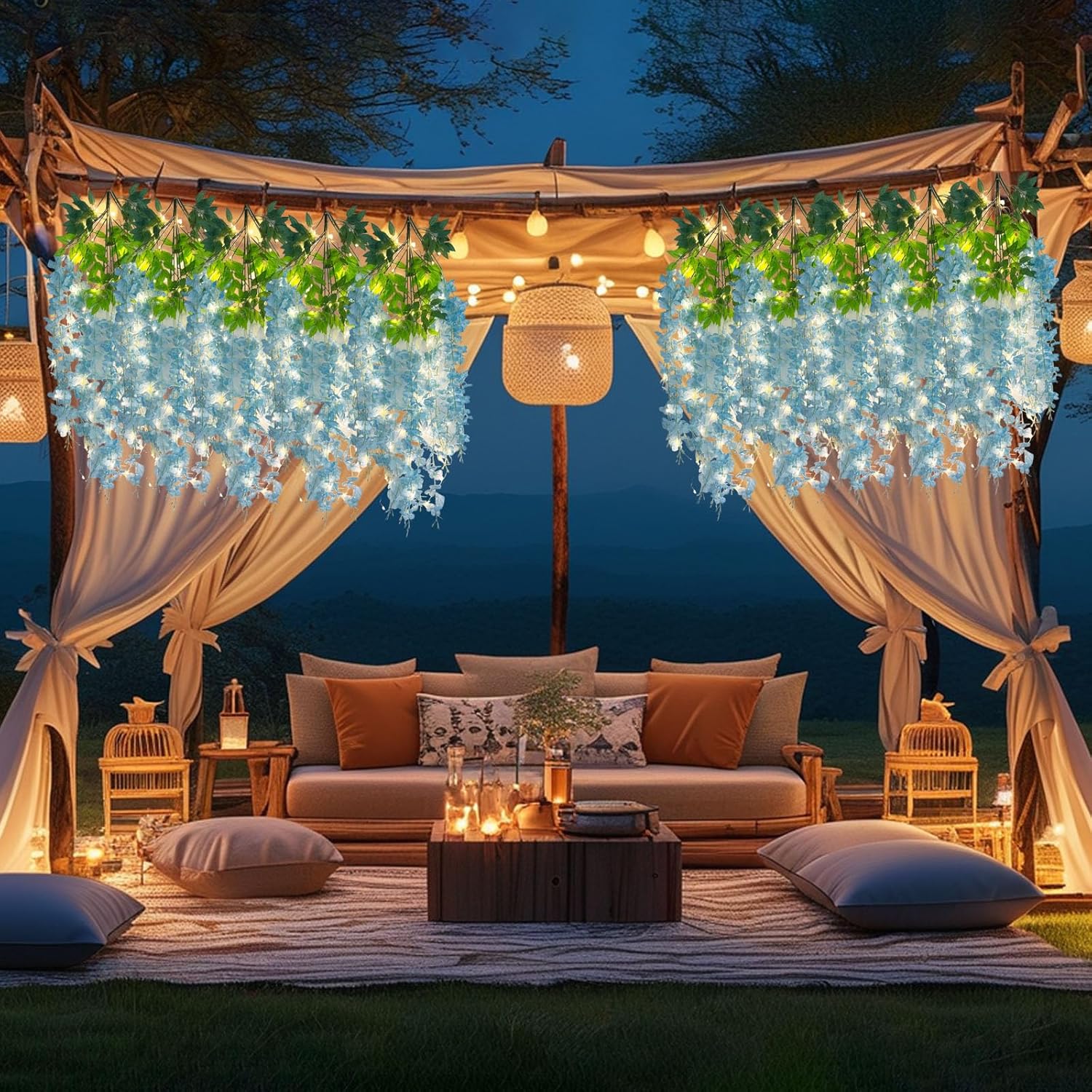 12 Pack Lake Blue Wisteria Hanging Flowers Garland with Lights, 3.44 Feet Artificial Flower Vines, Fake Wisteria, Artificial Vines Hanging Garland for Backdrop Outdoor Patio Garden Decor