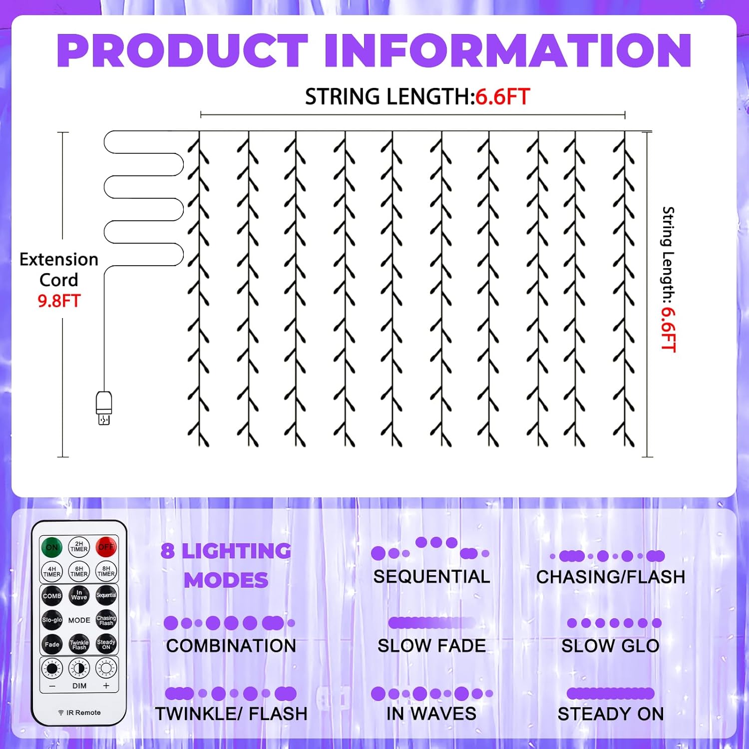 - Tangle-Free Curtain Lights: 200 super bright LED bulbs, the 6.6x6.6Ft curtain lights come with a 9.8Ft extension cord; With 10 drop light strings, each holding 20 LEDs, and convenient hooks at the top for easy hanging, they effortlessly add warmth and sparkle to any room, creating a dreamy, fairytale ambiance that fills your space with joy and serenity