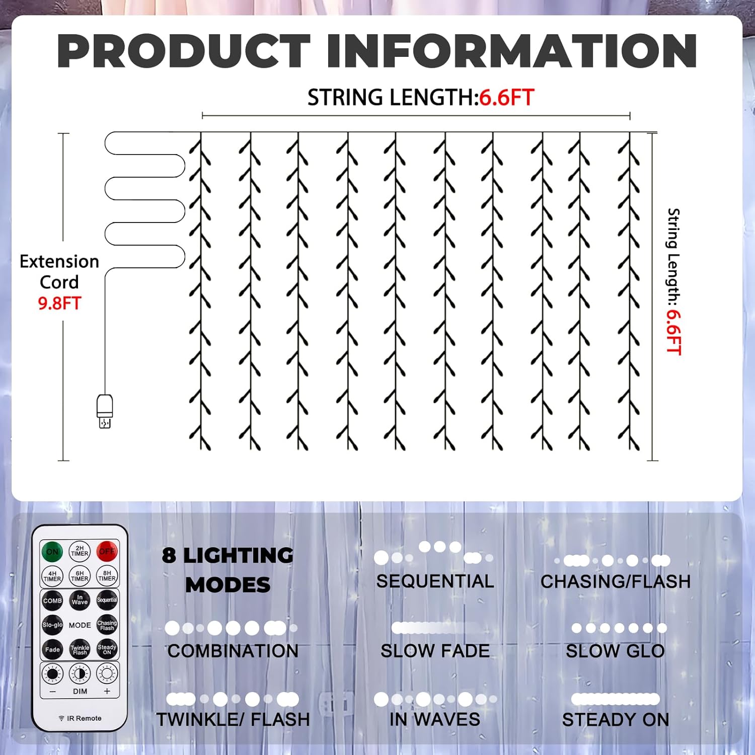 - Tangle-Free Curtain Lights: 200 super bright LED bulbs, the 6.6x6.6Ft curtain lights come with a 9.8Ft extension cord; With 10 drop light strings, each holding 20 LEDs, and convenient hooks at the top for easy hanging, they effortlessly add warmth and sparkle to any room, creating a dreamy, fairytale ambiance that fills your space with joy and serenity