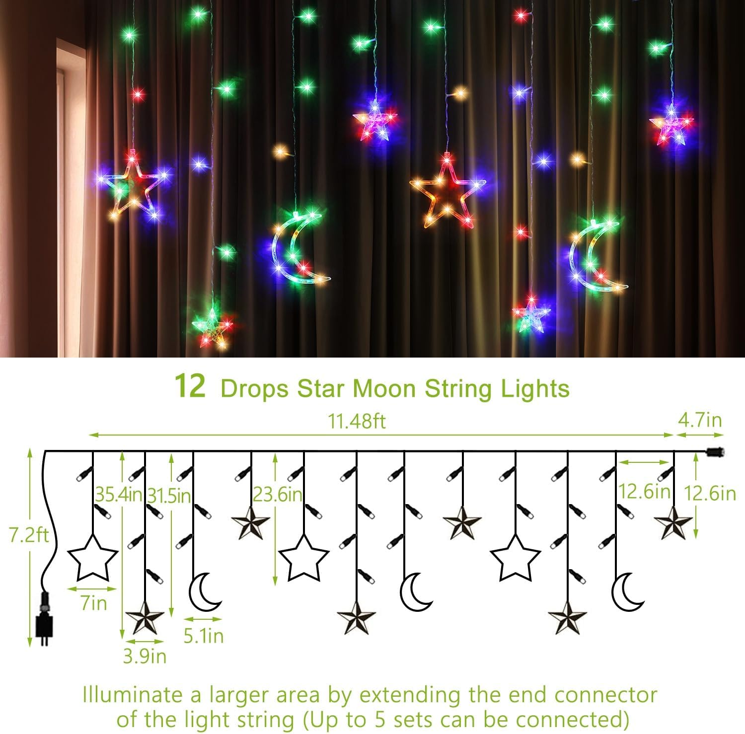 PUHONG Christmas String Lights, 138 LEDs Curtain Lights with 8 Light Modes, 11.48FT Star Moon Indoor Outdoor Fairy String for Window, Bedroom, Wall, Home, Ramadan, Christmas Decoration - Multicolored