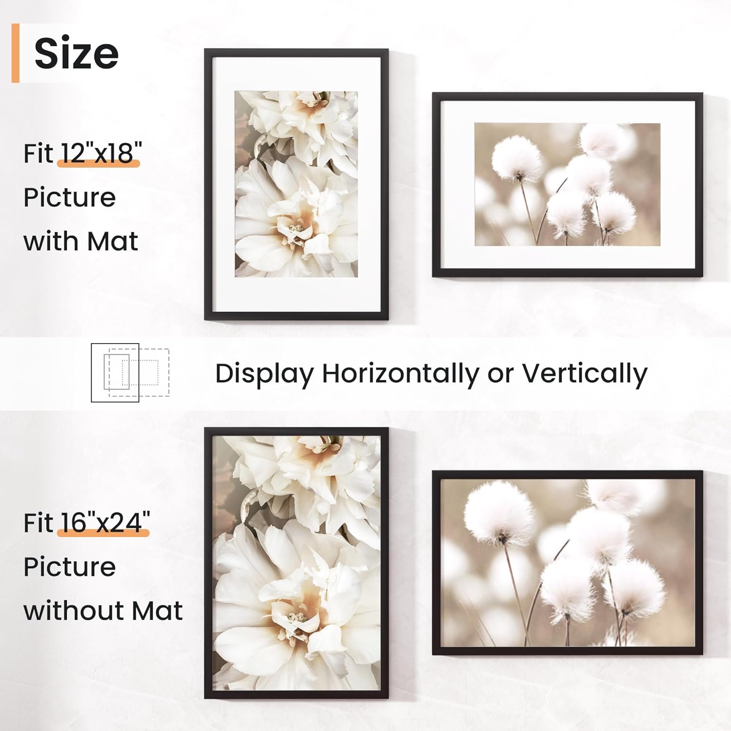 - Display Precious Memories - Showcase your cherished moments with our 16x24 plastic frame. It's lightweight yet sturdy with a superior quality finish. The white mat opening (measuring 11.5x17.5) is perfect for a 12x18 picture with the mat, or an 16x24 picture without it.
