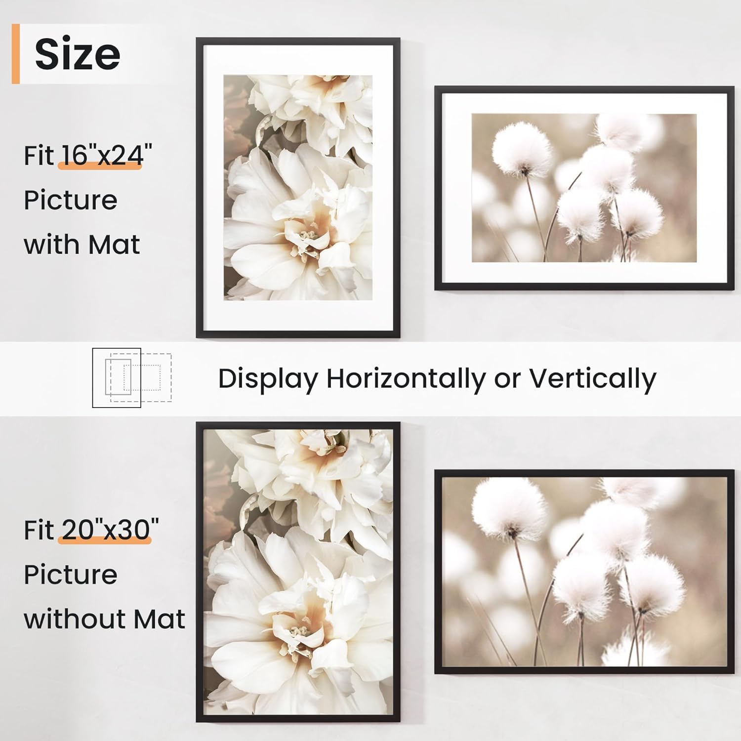 - Display Precious Memories - Showcase your cherished moments with our 20x30 plastic frame. It's lightweight yet sturdy with a superior quality finish. The white mat opening (measuring 15.5x23.5) is perfect for a 16x24 picture with the mat, or an 20x30 picture without it.