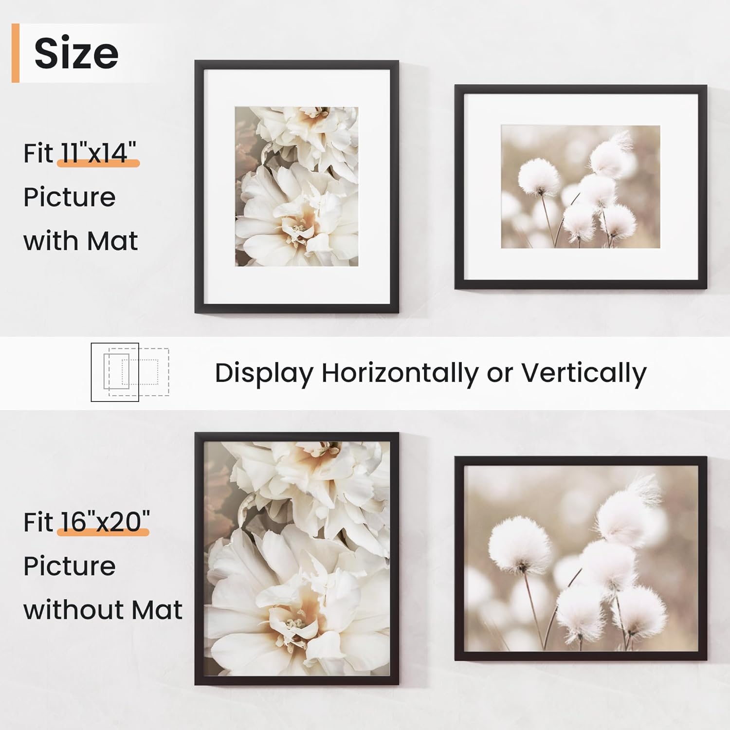 - Display Precious Memories - Showcase your cherished moments with our 16x20 plastic frame. It's lightweight yet sturdy with a superior quality finish. The white mat opening (measuring 10.5x13.5) is perfect for a 11x14 picture with the mat, or an 16x20 picture without it.