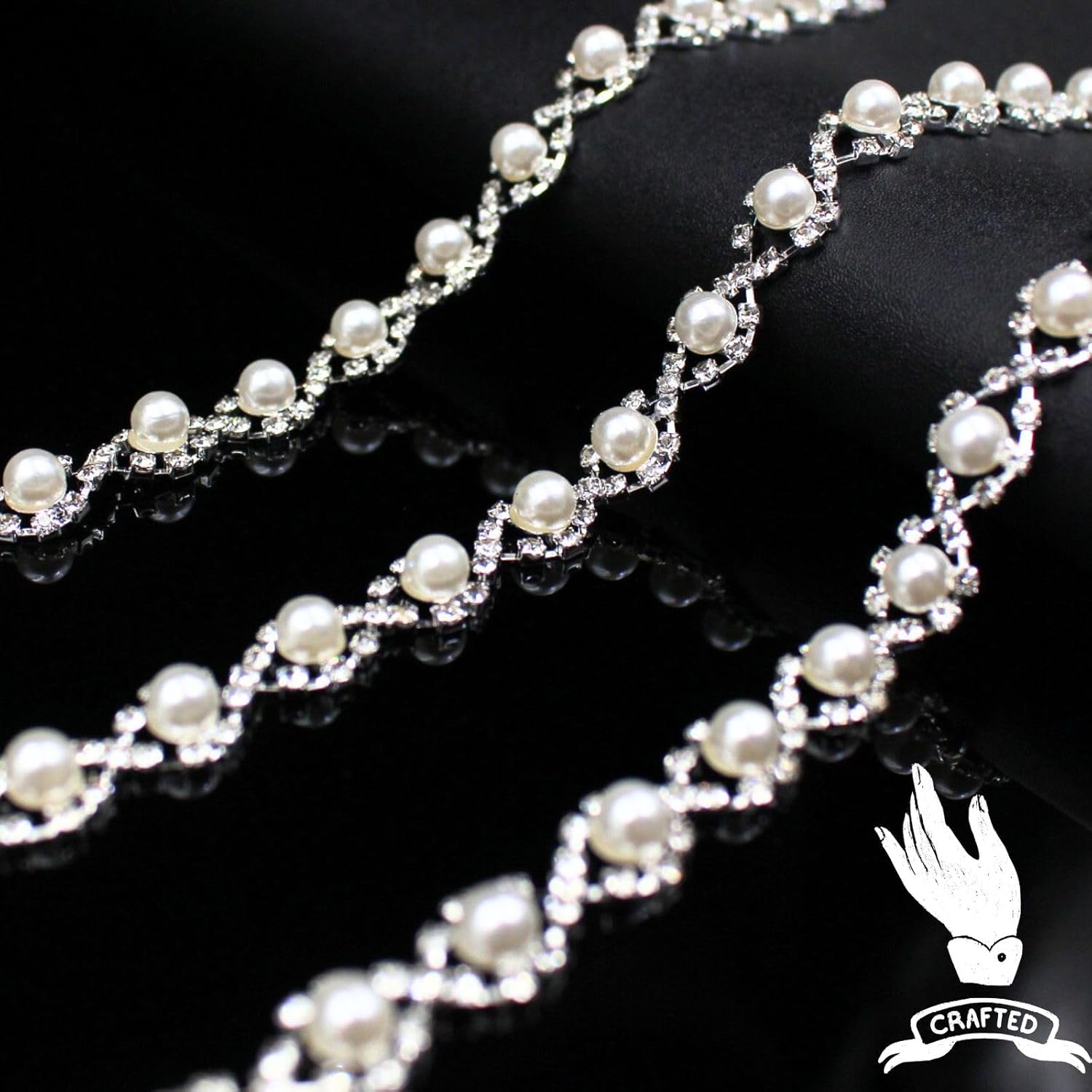 2 Yard Pearl Rhinestone Trim Chain Silver String Crystal Applique Fringe Ribbon Strips Beads Sewing Dress DIY Party Wedding Bouquet for Decoration Bridal Costume Embellishment