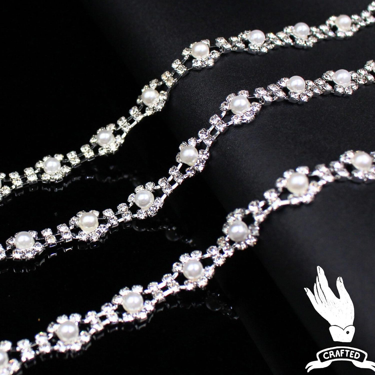 1 Yard Pearl Rhinestone Trim Chain Silver String Crystal Applique Fringe Ribbon Strips Beads Sewing Dress DIY Party Wedding Bouquet for Decoration Bridal Costume Embellishment