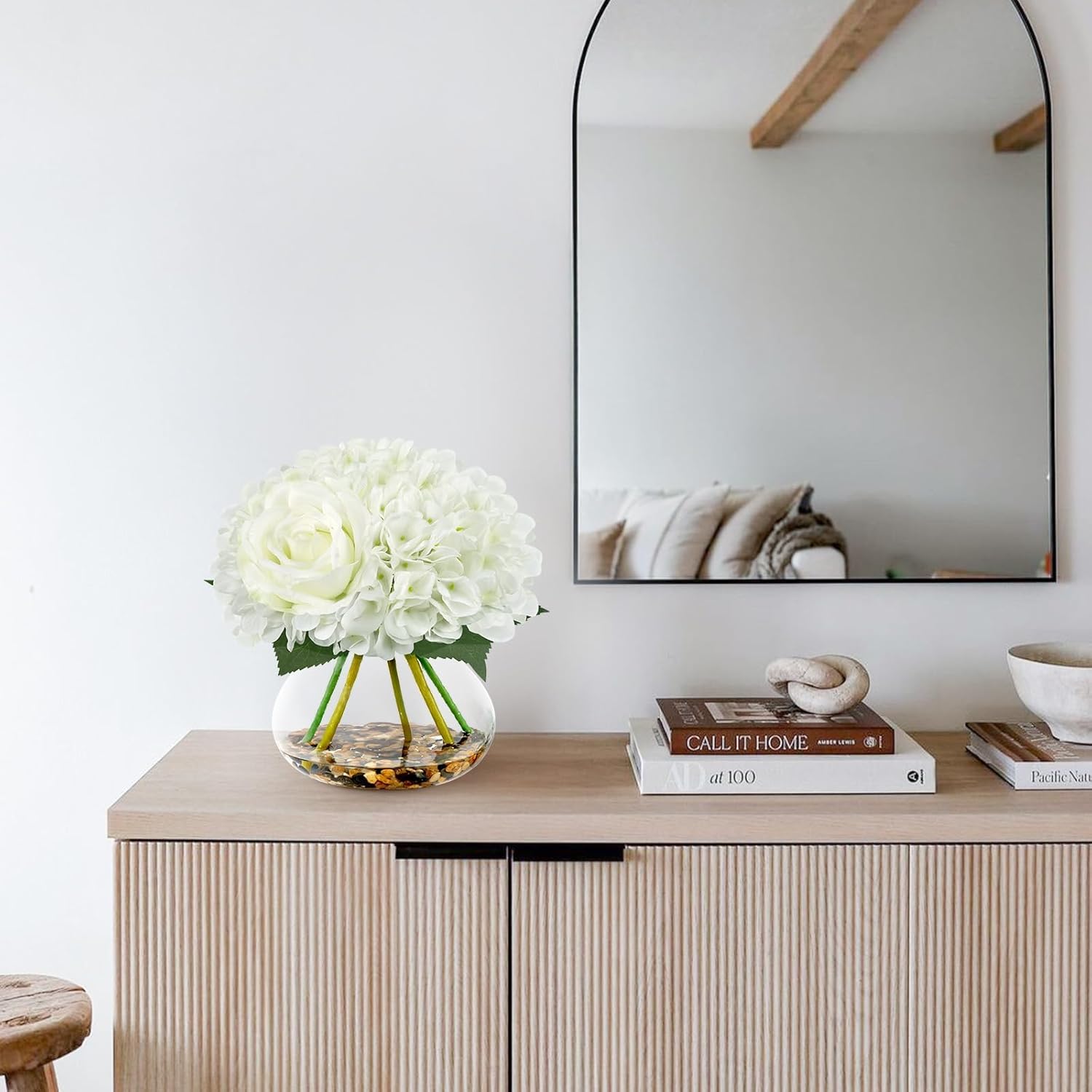 - Fake Flowers with Vase: Hydrangea artificial flowers is paired with a glass vase containing a rainflower stone. Unlike other faux hydrangea flowers, the real stone adds beauty and realism to the white hydrangea artificial flowers, giving people a different visual enjoyment.Our artificial flowers comes with vase decoration, no need to purchase a new vase
