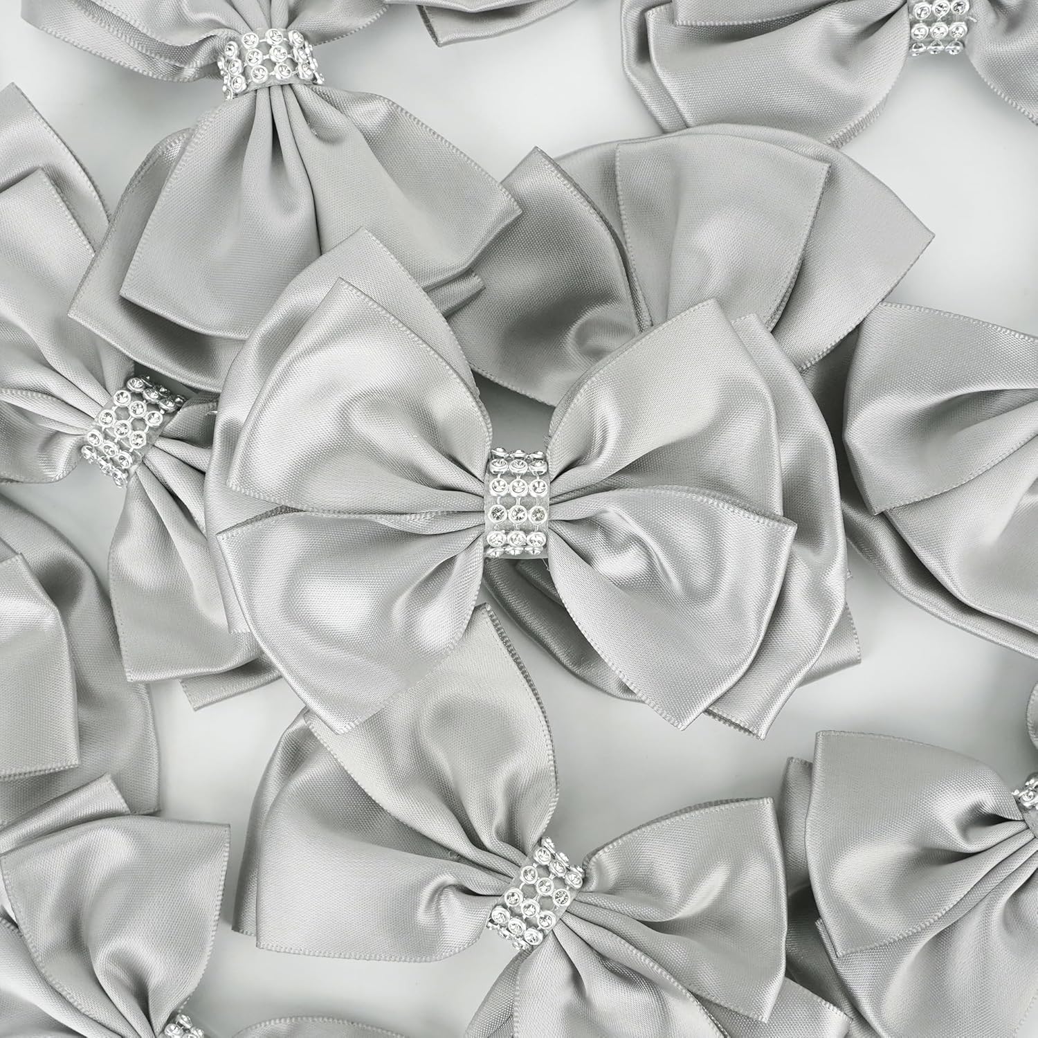 Silver Satin Bows 4'' Premade Ribbon Bow, Silver Gift Bows with Rhinestone, Wrapping Bows for Presents, Greeting Cards, Treat Bags, Wine Bottles, Valentines Bows for Gift Wrapping-12 Counts