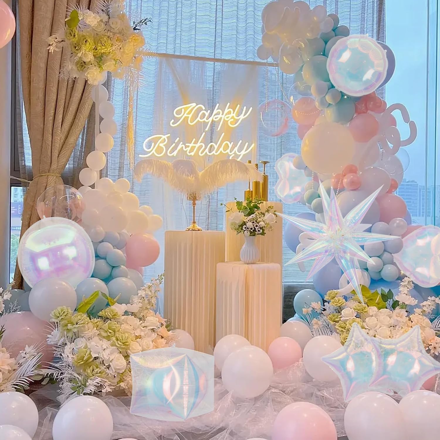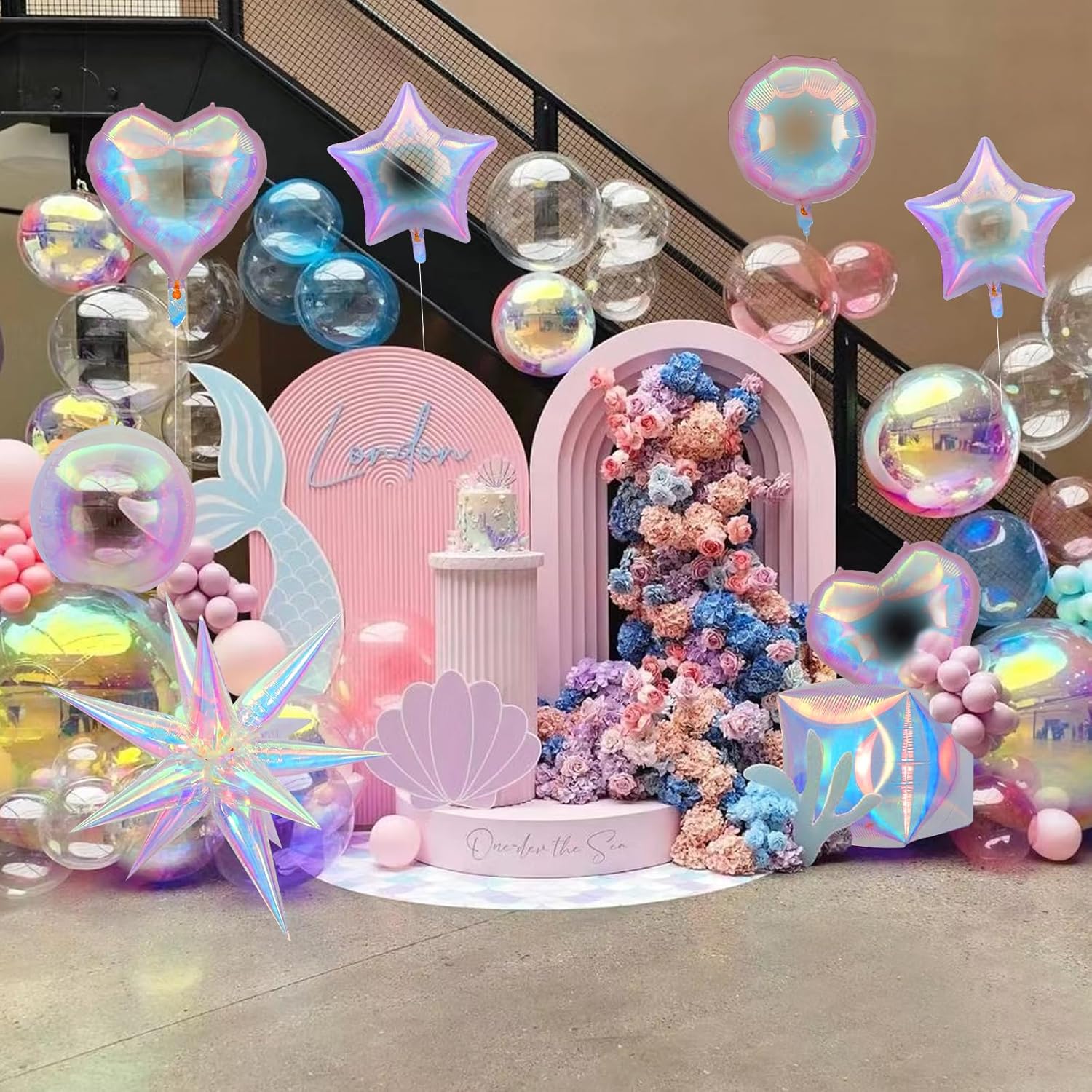 - Vibrant Decorations: Elevate your party with this set of 9 iridescent balloons in star, heart, starburst, laser 4D cube, and clear foil designs, ranging from 18-27 inches, 12pcs 48cm droplet shaped balloons (combined into 68cm explosion star balloons)