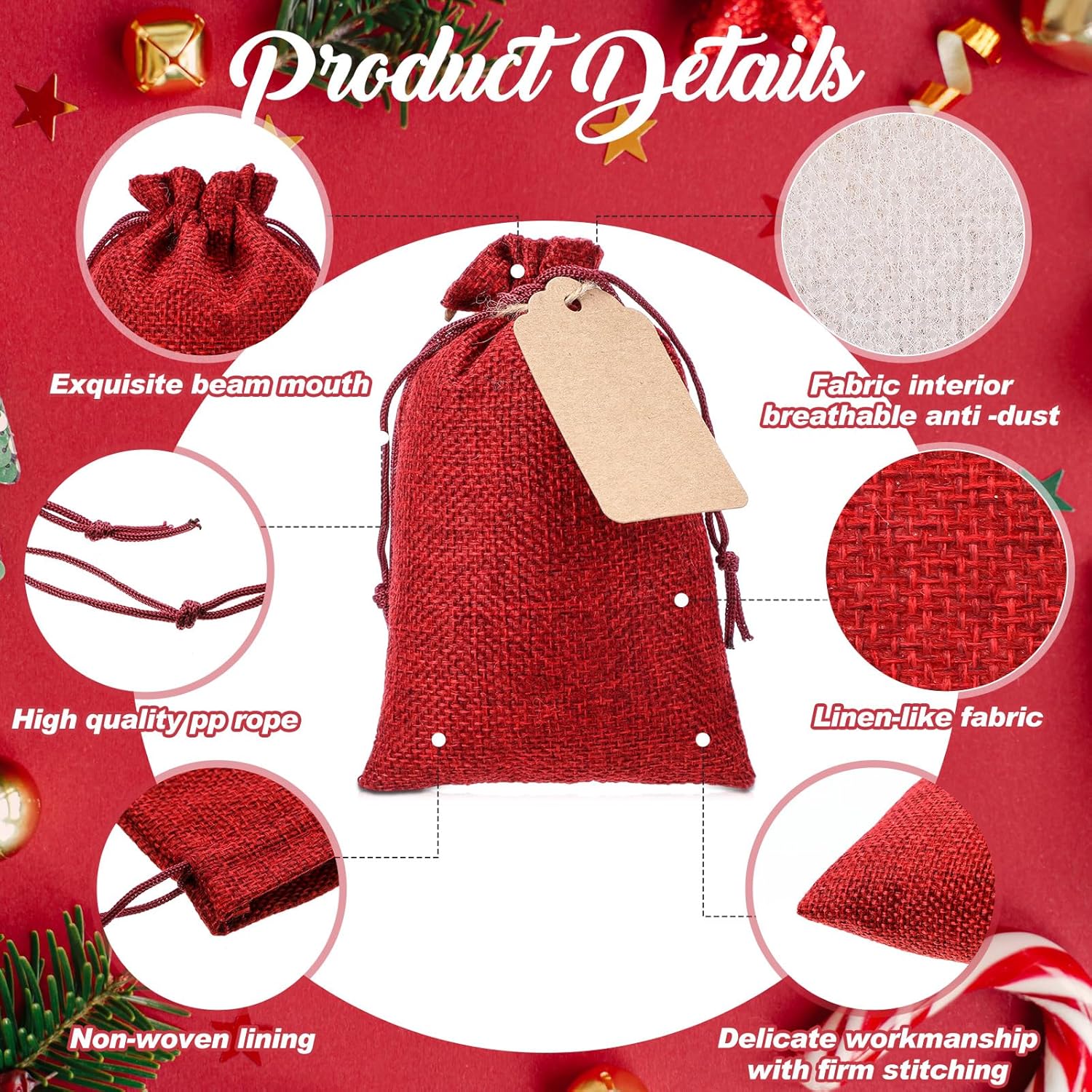 - Included Components : 100 Pcs Burlap Gift Bags, 100 Pcs Gift Tags, 1 Bundle Hemp Rope, 10 Pcs Red Gift Bags