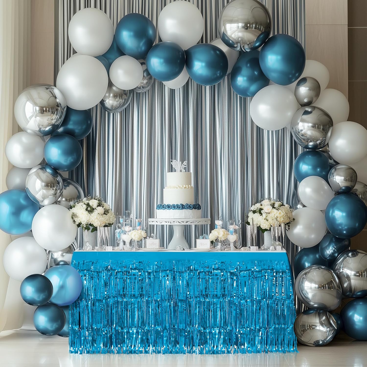 4 Pack Lake Blue Table Skirts, 29x108" Metallic Foil Tinsel Fringe Table Skirts for Rectangle Tables Streamer Curtains Backdrop, Party Decorations for Birthdays Weddings Holidays